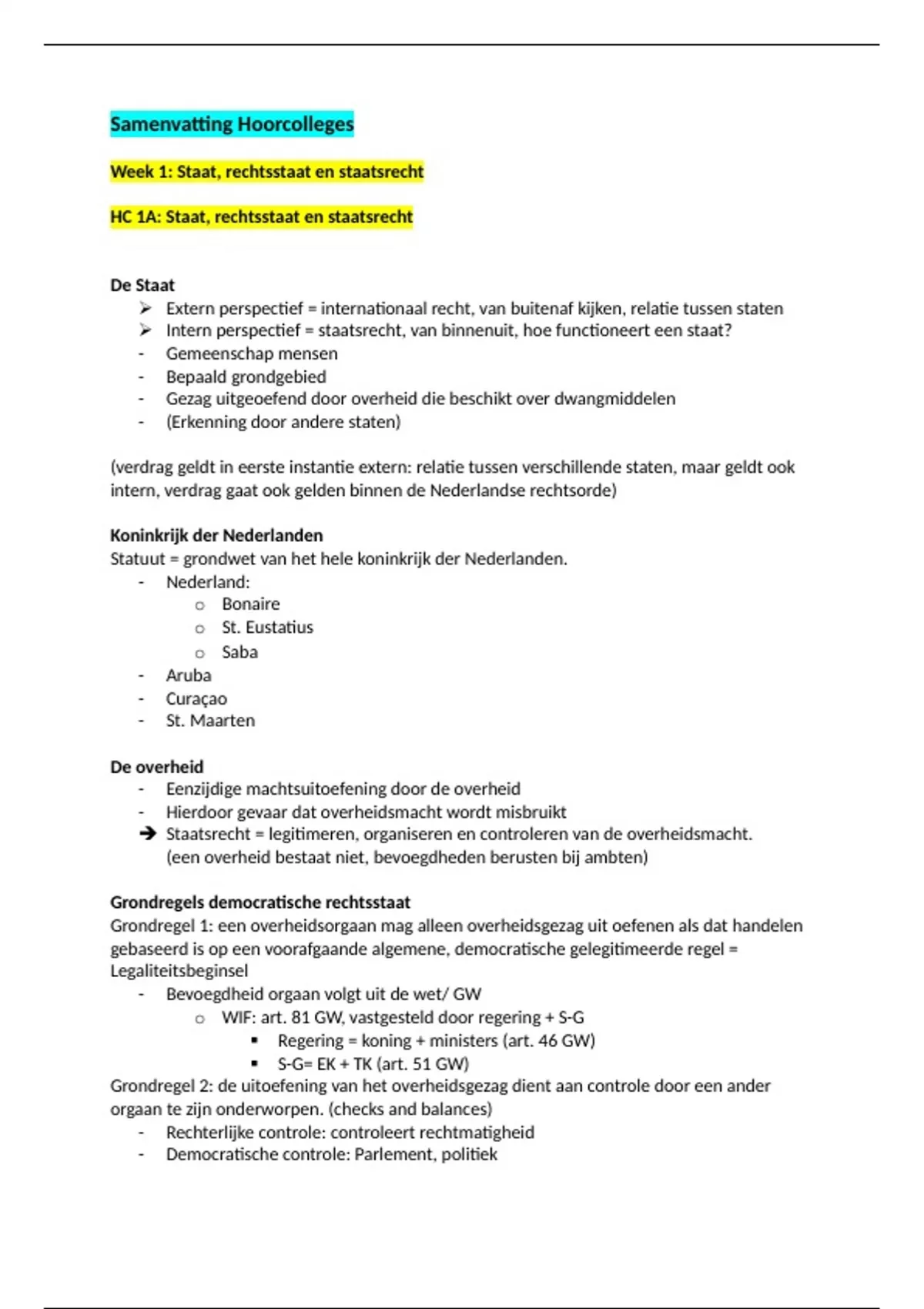 Samenvatting van alle belangrijke stof van Staatsrecht 1. inclusief HC aantekeningen. Arresten ook overzichtelijk uitgelegd.