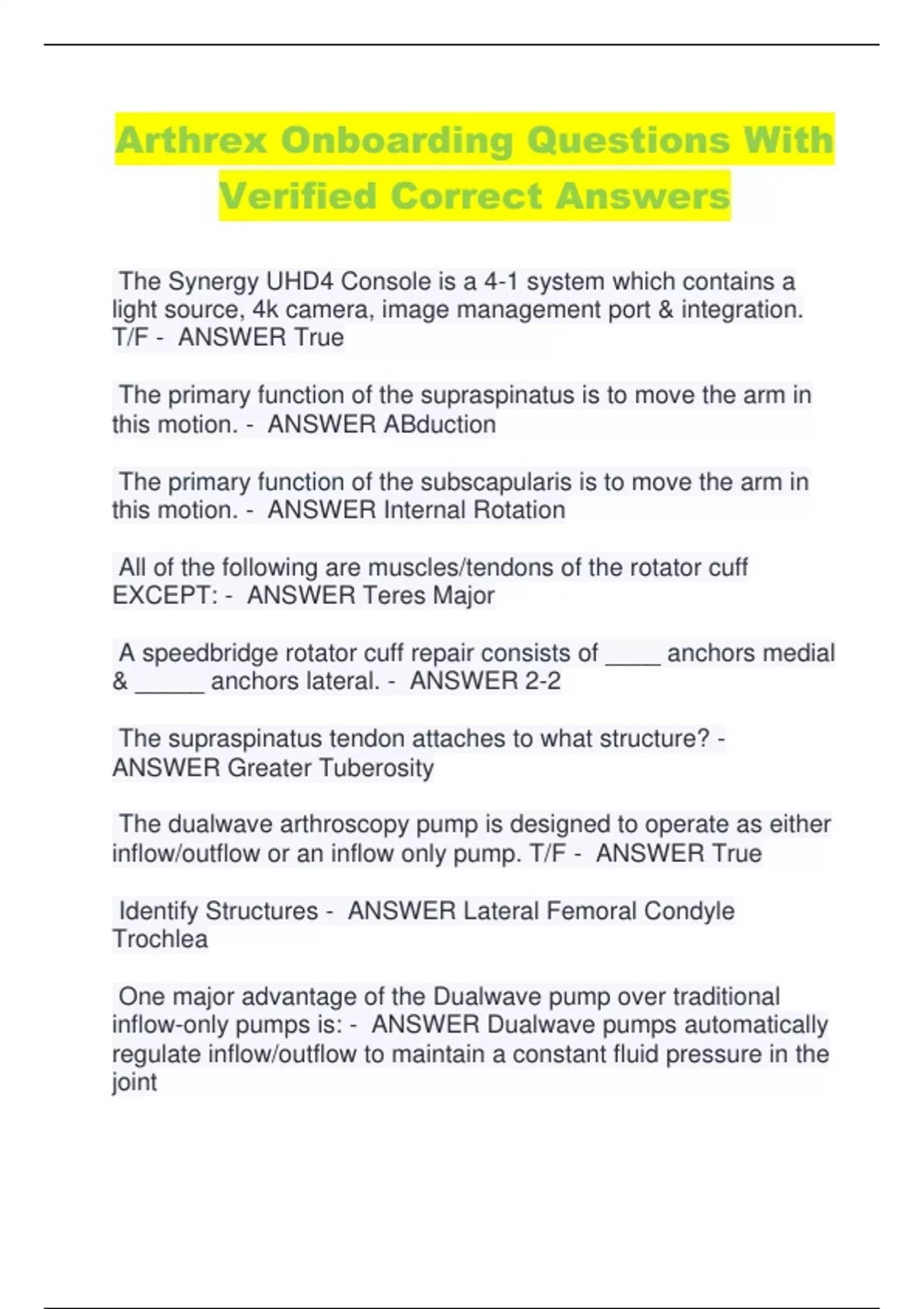 Arthrex Onboarding Questions With Verified Correct Answers The Synergy UHD4 Console is a 4-1 system which contains a light source, 4k camera, image management port & integration. T/F - ANSWER True The primary function of the supraspinatus is to move the arm in this motion. - ANSWER ABduction The primary function of the subscapularis is to move the arm in this motion. - ANSWER Internal Rotation All of the following are muscles/tendons of the rotator cuff EXCEPT: - ANSWER Teres Major A speedbridge rotator cuff repair consists of ____ anchors medial & _____ anchors lateral. - ANSWER 2-2 The supraspinatus tendon attaches to what structure? - ANSWER Greater Tuberosity The dualwave arthroscopy pump is designed to operate as either inflow/outflow or an inflow only pump. T/F - ANSWER True Identify Structures - ANSWER Lateral Femoral Condyle Trochlea One major advantage of the Dualwave pump over traditional inflow-only pumps is: - ANSWER Dualwave pumps automatically regulate inflow/outflow to maintain a constant fluid pressure in the joint Proximal refers to being closer to the main mass of the body. T/F - ANSWER True