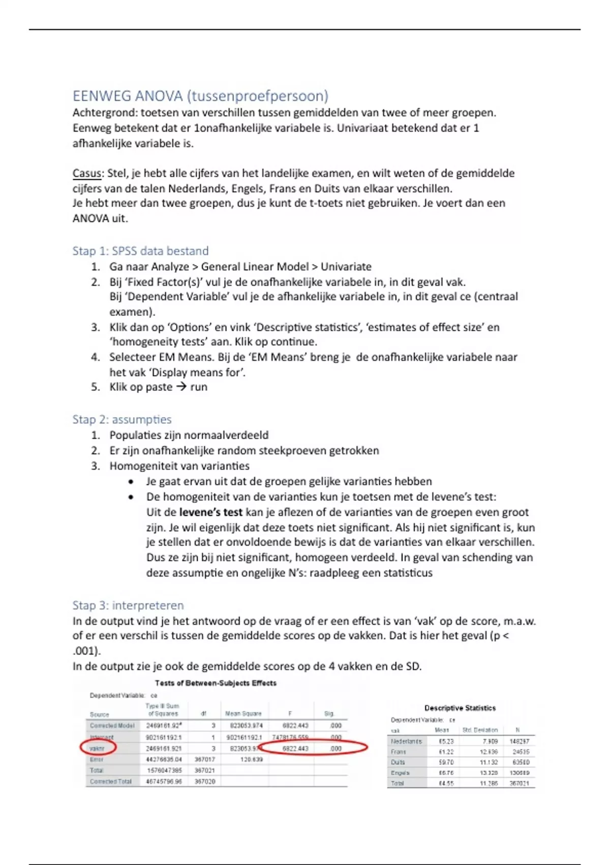 In de output zie je ook de gemiddelde scores op de 4 vakken en de SD.