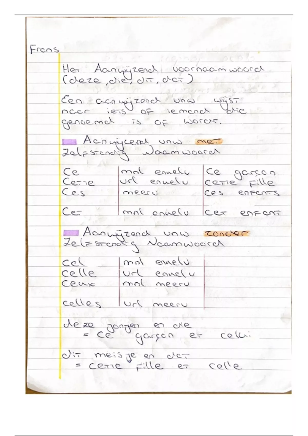 Het Franse Aanwijzend Voornaamwoord. Het Aanwijzend Voornaamwoord overzichtelijk uitgewerkt op papier. Handig om te gebruiken ,want het is wel eventjes een belangrijk stukje grammatica. Voor Havo4 leerlingen aan te raden!