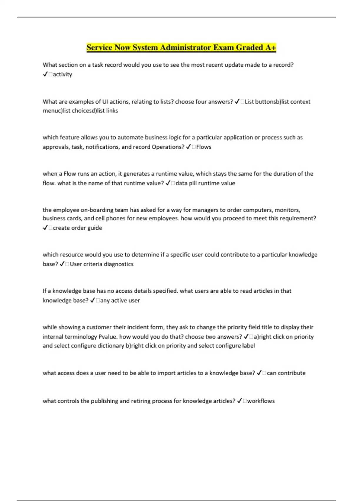 Service Now System Administrator Exam Graded A+ What section on a task record would you use to see the most recent update made to a record? ️activity What are examples of UI actions, relating to lists? choose four answers? ️List buttonsb)list context menuc)list choicesd)list links which feature allows you to automate business logic for a particular application or process such as approvals, task, notifications, and record Operations? ️Flows when a Flow runs an action, it generates a runtime value, which stays the same for the duration of the flow. what is the name of that runtime value? ️data pill runtime value the employee on-boarding team has asked for a way for managers to order computers, monitors, business cards, and cell phones for new employees. how would you proceed to meet this requirement? ️create order guide which resource would you use to determine if a specific user could contribute to a particular knowledge base? ️User criteria diagnostics If a knowledge base has no access details specified. what users are able to read articles in that knowledge base? ️any active user while showing a customer their incident form, they ask to change the priority field title to display their internal terminology Pvalue. how would you do that? choose two answers? ️a)right click on priority and select configure dictionary b)right click on priority and select configure label what access does a user need to be able to import articles to a knowledge base? ️can contribute what controls the publishing and retiring process for knowledge articles? ️workflows what is an advantage of defining relationship types between ci classes? ️makes relating CIs easier, because predefined relationship suggests which type of CIs should be when using the CI dependency view, how would you view the relationship between one CI and another CI? ️Hover on connection line Of the Ci tables, which is a base table of the CMDB hierarchy? ️cmdb what table acts as a staging area for records imported from a data source? ️import set row table which field (or fields) is used as a unique key during imports? ️coalesce fields what module enables an administrator to define destinations for imported data on any ServiceNow table? ️transform map the customer wants all users to have access to the records inthe offerings table. what setting on access control definition would you use to grant access to all of the offering table records? ️Offering. None a manager wants to review a snapshot of month end sales performance data, as compared to sales target. in addition, the manager wants to able to see those monthly numbers trended overtime and forecasted into the future. what capability do you suggest for this manager? ️performance analytics. which component ofa table contains a piece of data for one record?a) ️Field what do you click when you have made modifications to your report, and you want to see the results without saving? ️Run The report designer contains different sections for configuring your report. which section is used to specify grouping and calculations to be run against the data? ️Configure what section on the notes tab shows the history of the work documented on the record? ️Activity Your customer wants to update a notification, so it is sent to the caller and also to the manager of the caller. how would you approach this requirement? ️on who will receive tab, add caller field, dot walk to caller's Manager to add managers. An IT User calls the service desk Because they need to work on task records. all they can see his self service on their homepage when they log into the service now instance. what issue could explain this? choose two answers? ️b)that user account does not belong to any group which contains the ITIL role. d)their user account does not have itil role What type of rules specify which user groups are responsible to work on different types of tasks? ️Assignment using the module. system properties mycompany. what branding options are available? ️banner image, banner text From form designer, how would you define a section, so it displays as a tab? ️name the section When looking at a long list of records, you want to quickly filter, to show only those which have category of hardware. How might you do that? ️on the list, locate and right click on the value Hardware, select show matching groups are defined at what? ️A collection of users what is the best way to learn about performance analytics? ️take a service now performance analytics course on now learning A subject matter expert routinely receives task which have been worked by first and level support before receiving the assignment. what could you suggest, to make it easier for the expert to read only the work notes in the activity log? ️click funnel icon and select only work notes for a customer's inventory application,several inventory applications fields on a needed-on inventory ticket. this ticket will be assigned to inventory support team members. how would you start to implement this requirement? ️create inventory table as an extended table from the task table. then add the inventory specification fields, as needed. when using the report designer, it is best practice to makecopy of an existing report then make modification to your copy of that report. when viewing the report inside the designer, how would you make a copy of the report? ️click on the down triangleand select insert and stay while testing a catalog item for ordering an expensive computer, the mandatory approval is being skipped for requester Bob Smith, but not for any of the other requests. what could explain the issue? ️Bob Smith is a VIP what moduledo you use to access the report that are available to you? ️report's view/run Why is it recommended that you Limit update sets to maximum of 100 records? Choose 2 answers? ️c)reduce potential conflicts e)make it easier to identify and review changes which flow components allow you