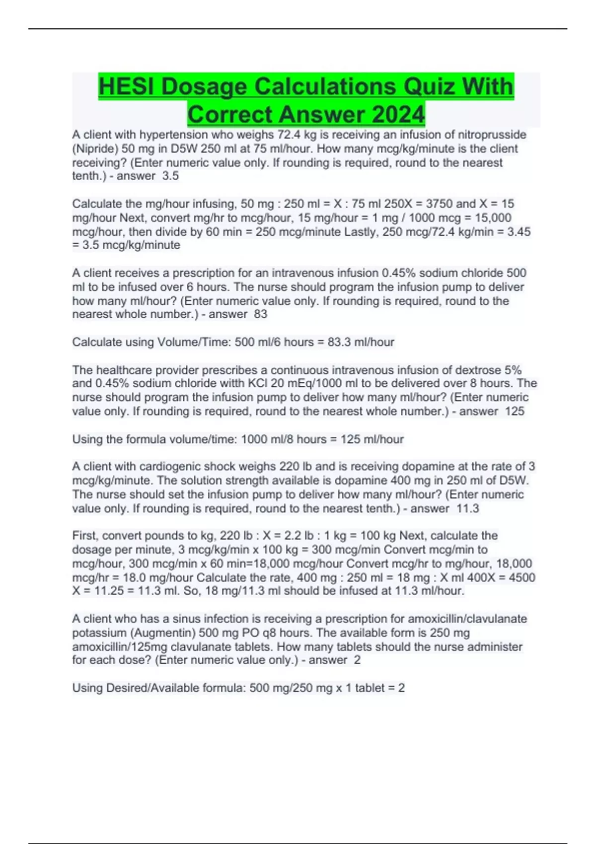 A client with hypertension who weighs 72.4 kg is receiving an infusion of nitroprusside (Nipride) 50 mg in D5W 250 ml at 75 ml/hour. How many mcg/kg/minute is the client receiving? (Enter numeric value only. If rounding is required, round to the nearest tenth.) - answer 3.5 Calculate the mg/hour infusing, 50 mg : 250 ml = X : 75 ml 250X = 3750 and X = 15 mg/hour Next, convert mg/hr to mcg/hour, 15 mg/hour = 1 mg / 1000 mcg = 15,000 mcg/hour, then divide by 60 min = 250 mcg/minute Lastly, 250 mcg/72.4 kg/min = 3.45 = 3.5 mcg/kg/minute A client receives a prescription for an intravenous infusion 0.45% sodium chloride 500 ml to be infused over 6 hours. The nurse should program the infusion pump to deliver how many ml/hour? (Enter numeric value only. If rounding is required, round to the nearest whole number.) - answer 83