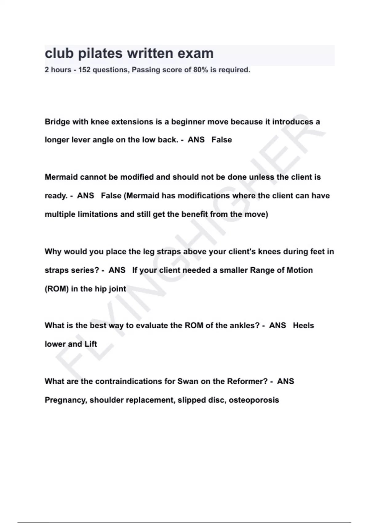 club pilates written exam 2 hours 152 questions