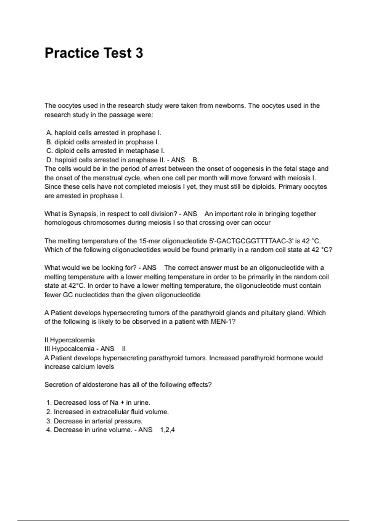 The oocytes used in the research study were taken from newborns. The oocytes used in the research study in the passage were: A. haploid cells arrested in prophase I. B. diploid cells arrested in prophase I. C. diploid cells arrested in metaphase I. D. haploid cells arrested in anaphase II. - ANS B. The cells would be in the period of arrest between the onset of oogenesis in the fetal stage and the onset of the menstrual cycle, when one cell per month will move forward with meiosis I. Since these cells have not completed meiosis I yet, they must still be diploids. Primary oocytes are arrested in prophase I. What is Synapsis, in respect to cell division? - ANS An important role in bringing together homologous chromosomes during meiosis I so that crossing over can occur The melting temperature of the 15-mer oligonucleotide 5'-GACTGCGGTTTTAAC-3' is 42 °C. Which of the following oligonucleotides would be found primarily in a random coil state at 42 °C? What would we be looking for? - ANS The correct answer must be an oligonucleotide with a melting temperature with a lower melting temperature in order to be primarily in the random coil state at 42°C. In order to have a lower melting temperature, the oligonucleotide must contain fewer GC nucleotides than the given oligonucleotide A Patient develops hypersecreting tumors of the parathyroid glands and pituitary gland. Which of the following is likely to be observed in a patient with MEN-1? II Hypercalcemia III Hypocalcemia - ANS II A Patient develops hypersecreting parathyroid tumors. Increased parathyroid hormone would increase calcium levels Secretion of aldosterone has all of the following effects? 1. Decreased loss of Na + in urine. 2. Increased in extracellular fluid volume. 3. Decrease in arterial pressure. 4. Decrease in urine volume. - ANS 1,2,4 Aldosterone causes increased sodium reabsorption, and because of the rise in systemic Na+, there will be decreased water loss, increased extracellular fluid volume, and increased blood pressure. It will not cause a decrease in blood pressure PDC deficiency is a rare genetic disease. In PDC deficiency, the pyruvate cannot be converted to acetyl-CoA. Which of the following conditions would be expected in patients with the disease? A. Metabolic alkalosis B. Lactic acidosis C. Hyperglycemia D. Hypolipidemia - ANS B. The cells can only undergo glycolysis and anaerobic respiration. The end product of anaerobic respiration in humans is lactic acid. Thus, patients with PDC deficiency have lactic acidosis What is an intercalating agent, in respect to DNA modifications? - ANS It inserts itself between base pairs in DNA. Which of the following would be the most effective method to determine if transcription of a gene had been silenced? A. DNA fingerprinting B. ELISA C. RT-PCR D. DNA sequencing - ANS C. RT-PCR uses reverse transcriptase to make cDNA from mRNA. The cDNA can then amplified, and then tested for. This is the only method listed that can be used to test for the presence of mRNA and determine if transcription of the gene is occurring or not. Most biological unsaturated fatty acids are cis and contain non-conjugated double bonds. Because of this, additional steps are required in β-oxidation. These most likely include: A. Changing a single double bond to trans via a reductase enzyme in the mitochondrial matrix. B. Combining two double bonds via a reductase enzyme (which uses NADPH as a reducing agent), then changing the resultant cis double bond to trans via an isomerase enzyme. - ANS B. Monounsaturated fatty acids require an isomerase enzyme to move the double bond during β -oxidation. Polyunsaturated fatty acids require both an isomerase and a reductase enzyme to complete β -oxidation; this also requires the reducing agent NADPH Muscle fibers are composed of small contractile units called sarcomeres. During contraction, which of the following occurs within a sarcomere? i Myosin filaments shorten. ii Actin filaments shorten. iii Overlap between actin and myosin