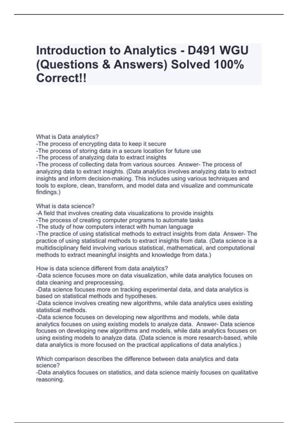 Introduction to Analytics - D491 WGU (Questions & Answers) Solved 100% Correct!!