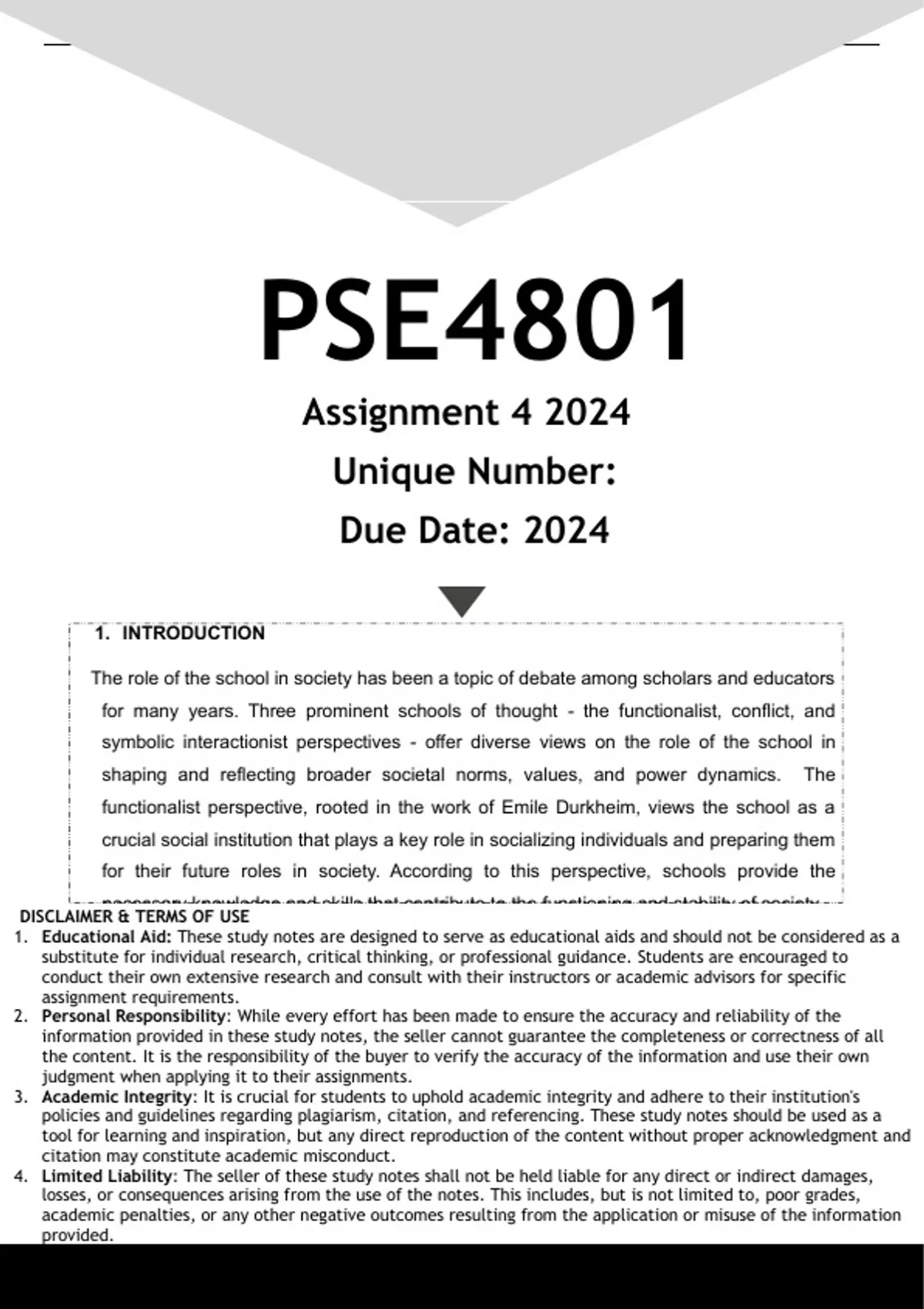 Well-structured PSE4801 Assignment 4 (ANSWERS) 2024 - DISTINCTION GUARANTEED. (DETAILED ANSWERS - DISTINCTION GUARANTEED!). .... Write an essay of no more than ten typed pages (cover page, table of content and bibliography excluded) on the following topic: Read the case study in your prescribed textbook, Feinberg, W. and Soltis, JF. 2009. School and Society – pp 116-118) on ‘The roots of school failure’ Use the following structure. 1. Introduction to the essay: Introduce the three schools of thought (theories/approaches) and their diverse views regarding the role of the school in society. (10) 2. Body of the essay: Present three arguments to demonstrate the viewpoints of the three schools of thought (Functionalism, Conflict Theory and Interpretivism) applicable to the case study. 2.1 Firstly, identify which viewpoints represent which school of thought (Whose viewpoint does B, C and D represent ̶ Functionalist, Conflict Theorist or Interpretivist?). (5) 2.2 Secondly, apply the theories mentioned above, and present arguments by using the case study text of the three schools of thought to construct the following arguments: 2.2.1 The functionalist’s argument applied to the case study (15) 2.2.2 The conflict theorist’s argument applied to the case study (15) 2.2.3 The interpretivist’s argument applied to the case study (15) 2.3 Thirdly, answer the following questions in detail: 32 - Are any of these views more correct? Will they make a difference in what teachers do? Substantiate your answer. (5) - Does any of these arguments make more sense to you than the others? (10) - What advice would you give to viewpoint ‘A’? (5) 3 Conclusion to the essay (no new information and/or argumentation): Conclude by stating the opposing views of the ‘roots of school failure’ of the three schools of thought respectively.