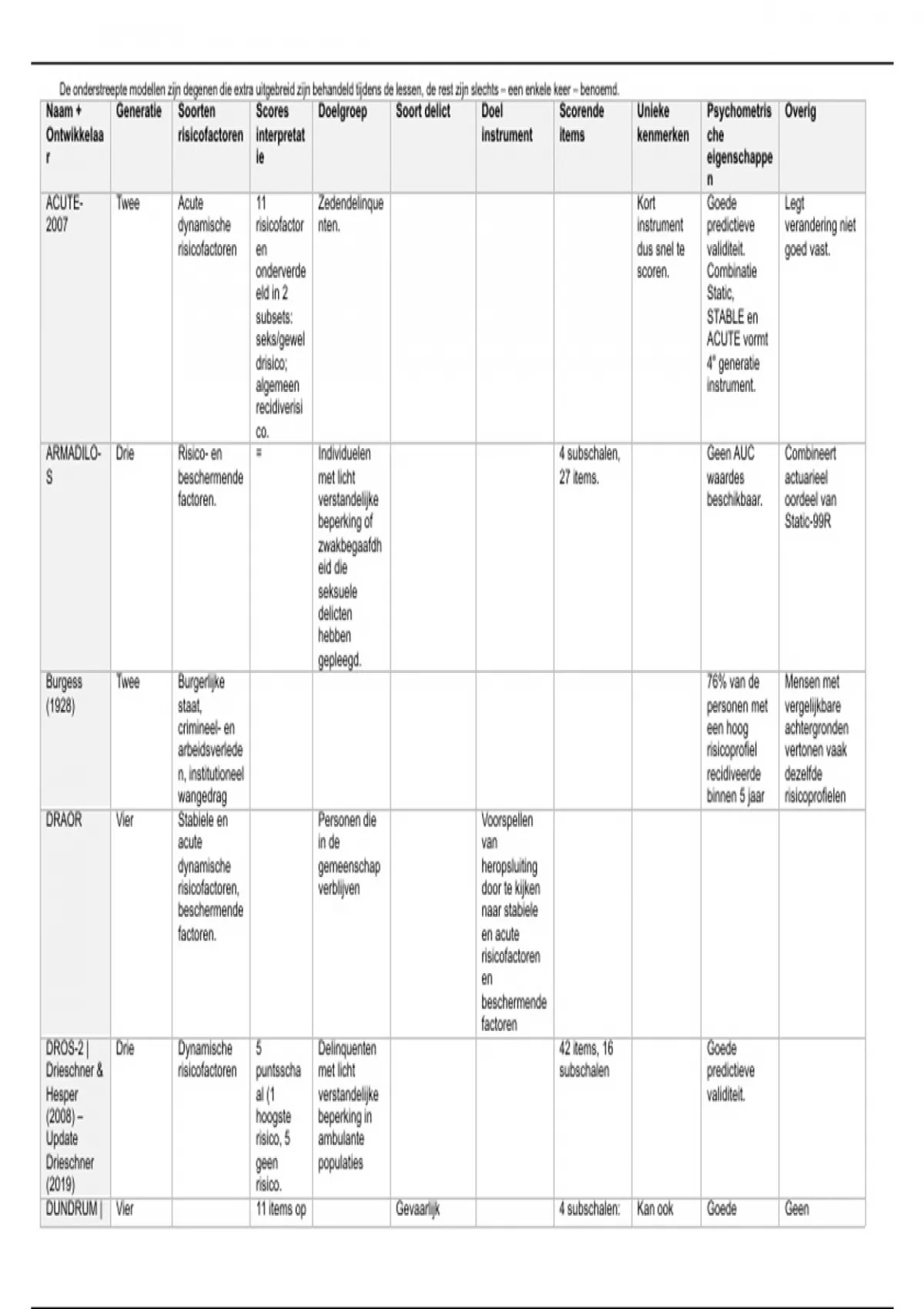 In dit bestand vind je de besproken risicotaxatie-instrumenten schematisch weergegeven. Elk instrument dat tijdens de les aan bod is gekomen is er in verwerkt, en alle informatie die er over verteld is. Het ligt er dus per instrument aan wat je ervan moet kennen, maar dit wordt duidelijk zodra je het schema ziet.