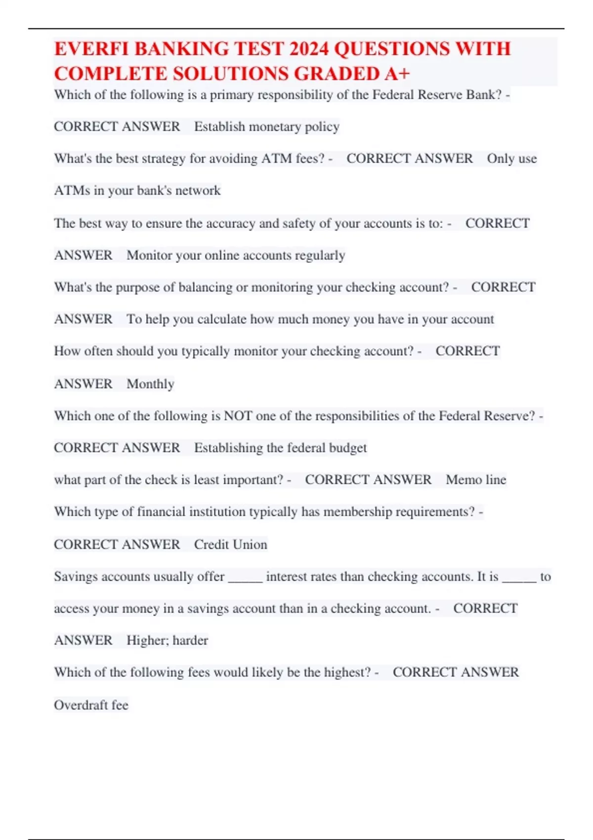 EVERFI BANKING TEST 2024 QUESTIONS WITH COMPLETE SOLUTIONS GRADED A+