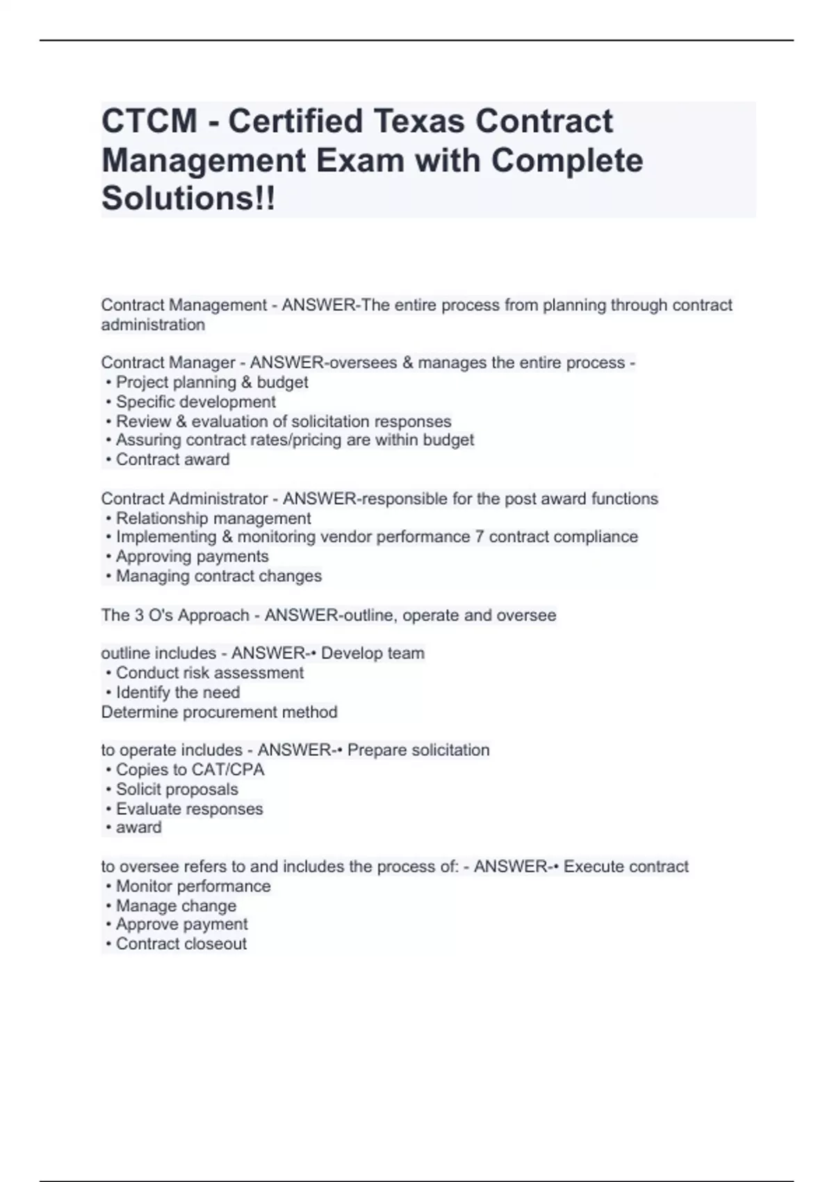 Contract Management - ANSWER-The entire process from planning through contract administration Contract Manager - ANSWER-oversees & manages the entire process - • Project planning & budget • Specific development • Review & evaluation of solicitation responses • Assuring contract rates/pricing are within budget • Contract award Contract Administrator - ANSWER-responsible for the post award functions • Relationship management • Implementing & monitoring vendor performance 7 contract compliance • Approving payments • Managing contract changes The 3 O's Approach - ANSWER-outline, operate and oversee outline includes - ANSWER-• Develop team • Conduct risk assessment • Identify the need Determine procurement method to operate includes - ANSWER-• Prepare solicitation • Copies to CAT/CPA • Solicit proposals