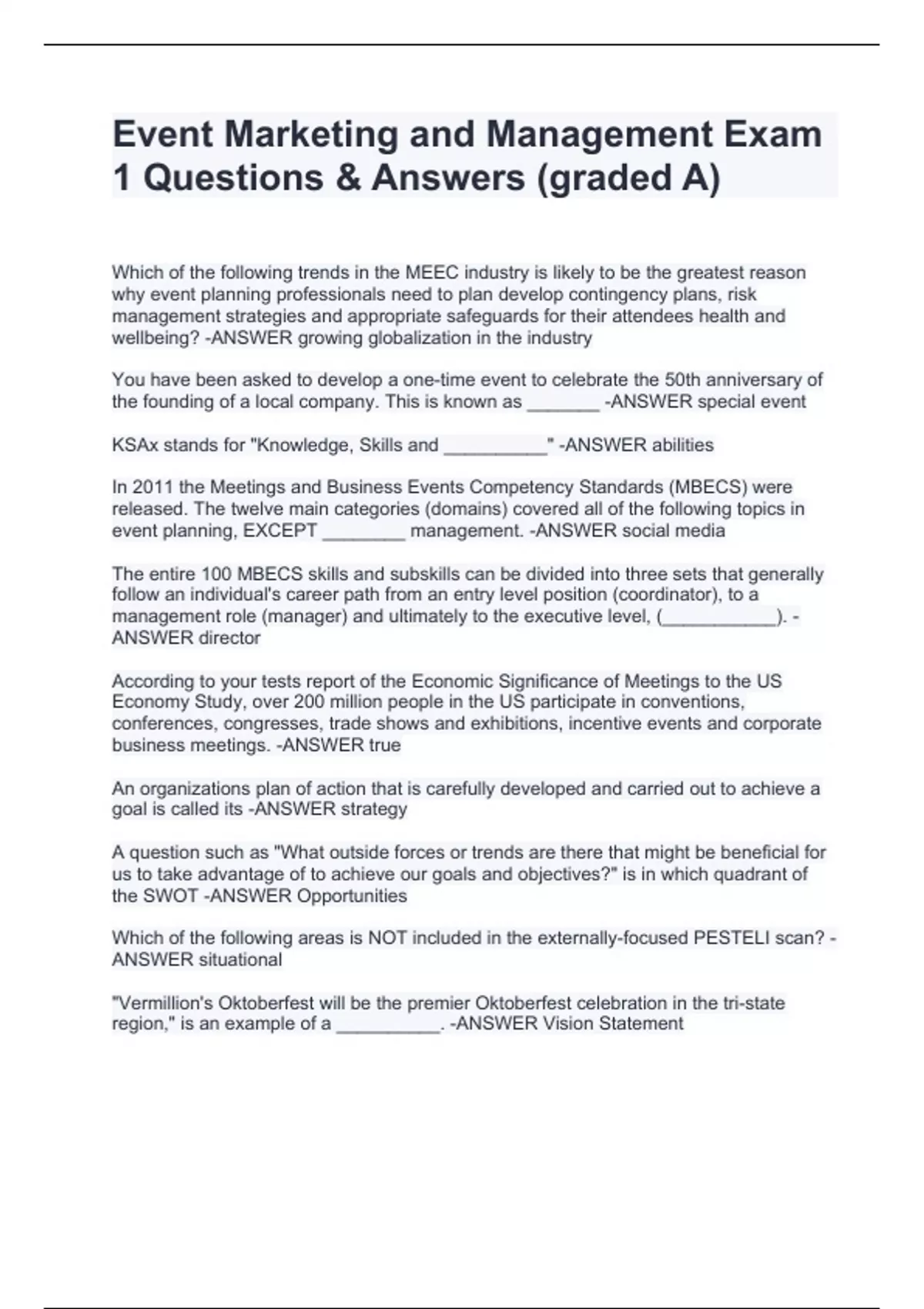 Event Marketing and Management Exam 1 Questions & Answers (graded A)Which of the following trends in the MEEC industry is likely to be the greatest reason why event planning professionals need to plan develop contingency plans, risk management strategies and appropriate safeguards for their attendees health and wellbeing? -ANSWER growing globalization in the industry You have been asked to develop a one-time event to celebrate the 50th anniversary of the founding of a local company. This is known as _______ -ANSWER special event KSAx stands for "Knowledge, Skills and __________" -ANSWER abilities In 2011 the Meetings and Business Events Competency Standards (MBECS) were released. The twelve main categories (domains) covered all of the following topics in event planning, EXCEPT ________ management. -ANSWER social media The entire 100 MBECS skills and subskills can be divided into three sets that generally follow an individual's career path from an entry level position (coordinator), to a management role (manager) and ultimately to the executive level, (___________). -ANSWER director According to your tests report of the Economic Significance of Meetings to the US Economy Study, over 200 million people in the US participate in conventions, conferences, congresses, trade shows and exhibitions, incentive events and corporate business meetings. -ANSWER true An organizations plan of action that is carefully developed and carried out to achieve a g