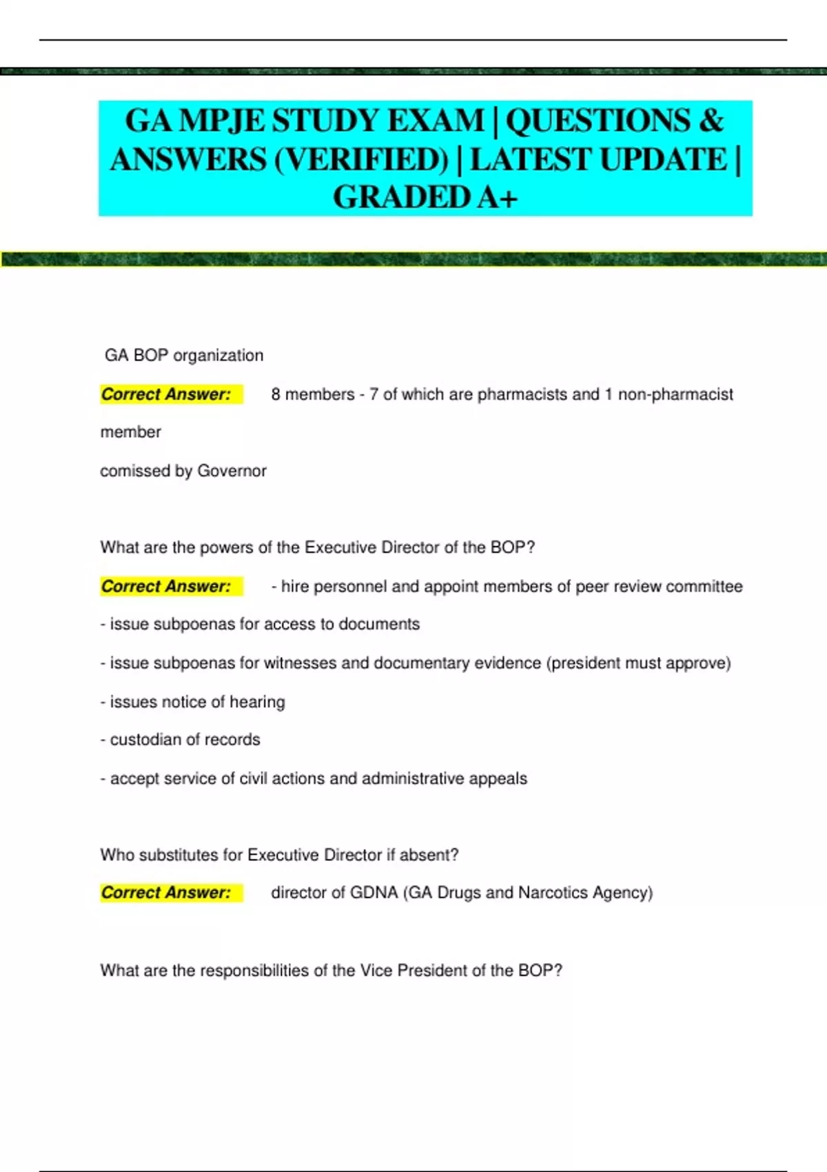 GA MPJE STUDY EXAM | QUESTIONS & ANSWERS (VERIFIED) | LATEST UPDATE | GRADED A+ GA BOP organization Correct Answer: 8 members - 7 of which are pharmacists and 1 non-pharmacist member comissed by Governor What are the powers of the Executive Director of the BOP? Correct Answer: - hire personnel and appoint members of peer review committee - issue subpoenas for access to documents - issue subpoenas for witnesses and documentary evidence (president must approve) - issues notice of hearing - custodian of records - accept service of civil actions and administrative appeals Who substitutes for Executive Director if absent? Correct Answer: director of GDNA (GA Drugs and Narcotics Agency) What are the responsibilities of the Vice President of the BOP? Correct Answer: - serves as contact member or liason between BOP and GDNA - receives findings from GDNA case reports/investigations - conducts investigative reviews and reports findings/makes recommendations to BOP What is required for licensure for licensure as a pharmacist? Correct Answer: - pay fees and application - age of majority - good moral character - graduated from SOP and received degree - 1500 hours internship in retail and hospital - passed exams (NAPLEX, MPJE, practical) What is required for reciprocity to GA? Correct Answer: - pay fees + application through NABP for BOP review and investigation by GDNA - age of majority - good moral character - proof of initial license in another state by examination - if coming from state that grants reciprocity to GA pharmacists - license in good standing - pass MPJE and practical When do pharmacist licenses have to be renewed