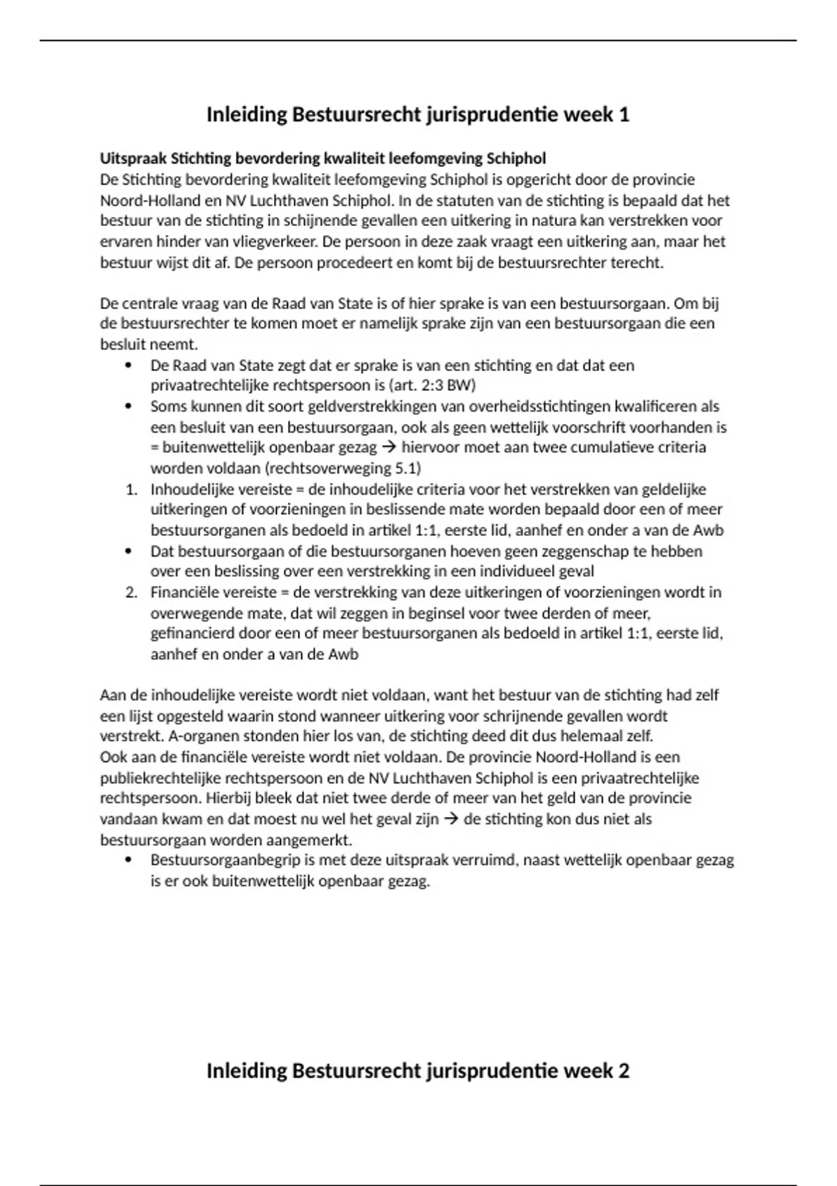 Een samenvatting van alle jurisprudentie die naast de lesstof opgegeven zijn van week 1 t/m 4 Vak: Inleiding Bestuursrecht Universiteit Leiden