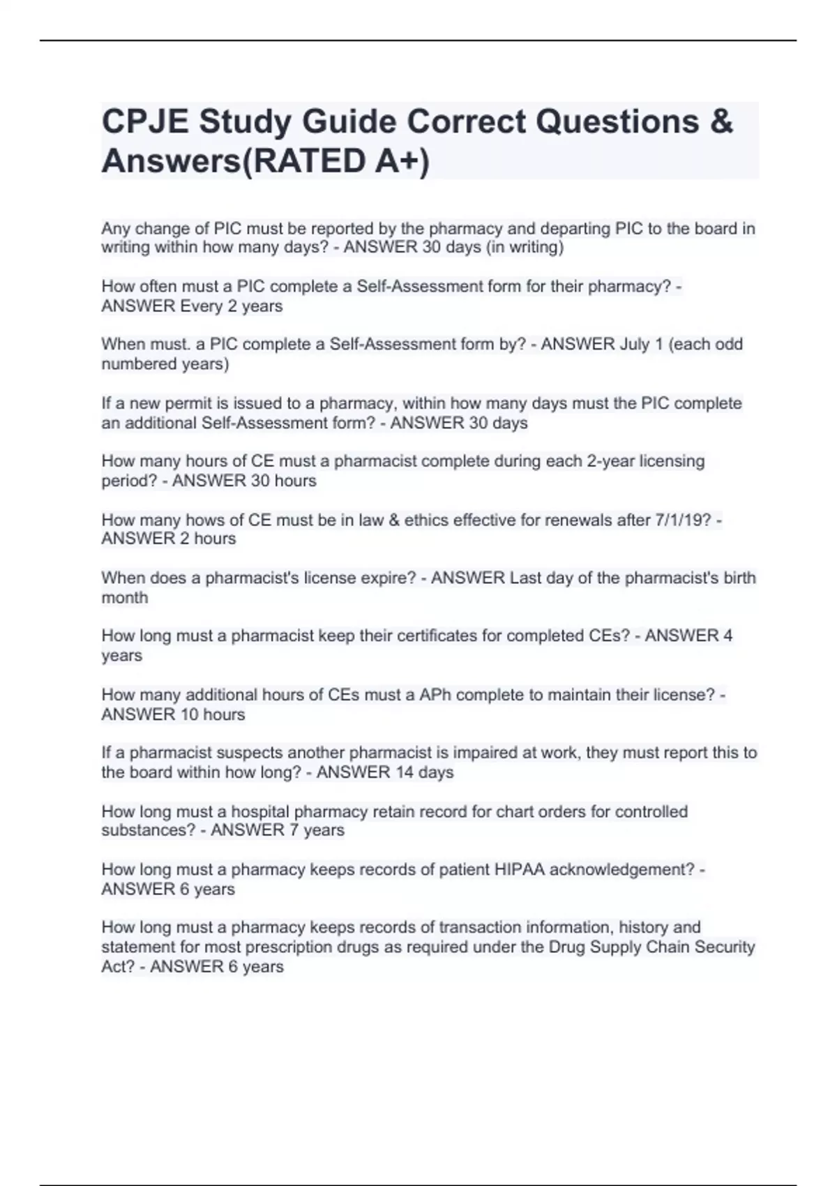 Any change of PIC must be reported by the pharmacy and departing PIC to the board in writing within how many days? - ANSWER 30 days (in writing) How often must a PIC complete a Self-Assessment form for their pharmacy? - ANSWER Every 2 years When must. a PIC complete a Self-Assessment form by? - ANSWER July 1 (each odd numbered years) If a new permit is issued to a pharmacy, within how many days must the PIC complete an additional Self-Assessment form? - ANSWER 30 days How many hours of CE must a pharmacist complete during each 2-year licensing period? - ANSWER 30 hours How many hows of CE must be in law & ethics effective for renewals after 7/1/19? - ANSWER 2 hours When does a pharmacist's license expire? - ANSWER Last day of the pharmacist's birth month How long must a pharmacist keep their certificates for completed CEs? - ANSWER 4 years How many additional hours of CEs must a APh complete to maintain their license? - ANSWER 10 hours If a pharmacist suspects another pharmacist is impair