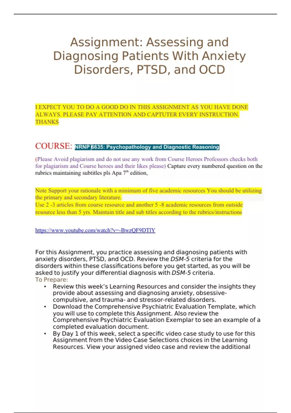 Assignment Assessing and Diagnosing Patients With Anxiety! RATED A+