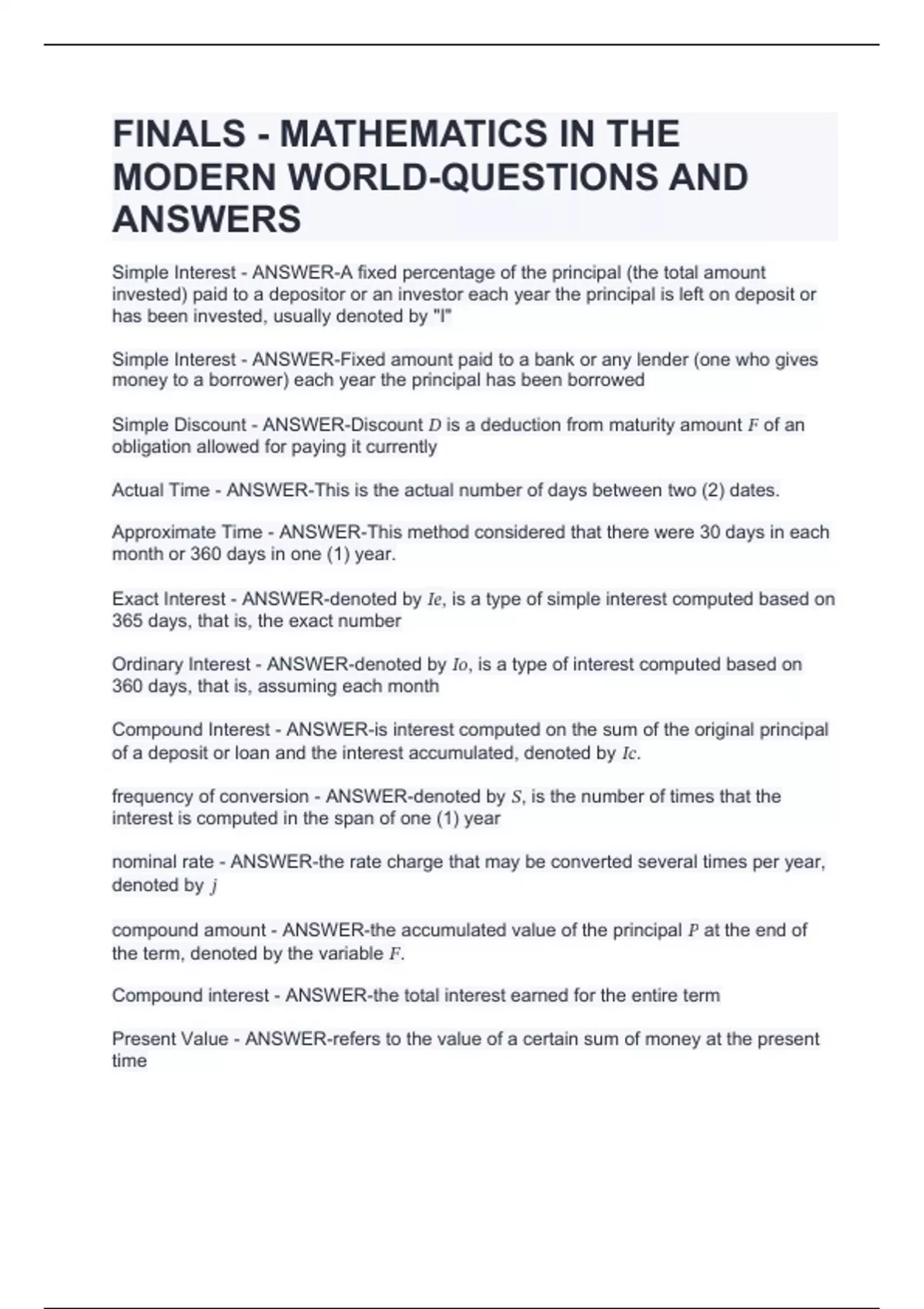 FINALS - MATHEMATICS IN THE MODERN WORLD-QUESTIONS AND ANSWERS Simple Interest - ANSWER-A fixed percentage of the principal (the total amount invested) paid to a depositor or an investor each year the principal is left on deposit or has been invested, usually denoted by "I" Simple Interest - ANSWER-Fixed amount paid to a bank or any lender (one who gives money to a borrower) each year the principal has been borrowed Simple Discount - ANSWER-Discount