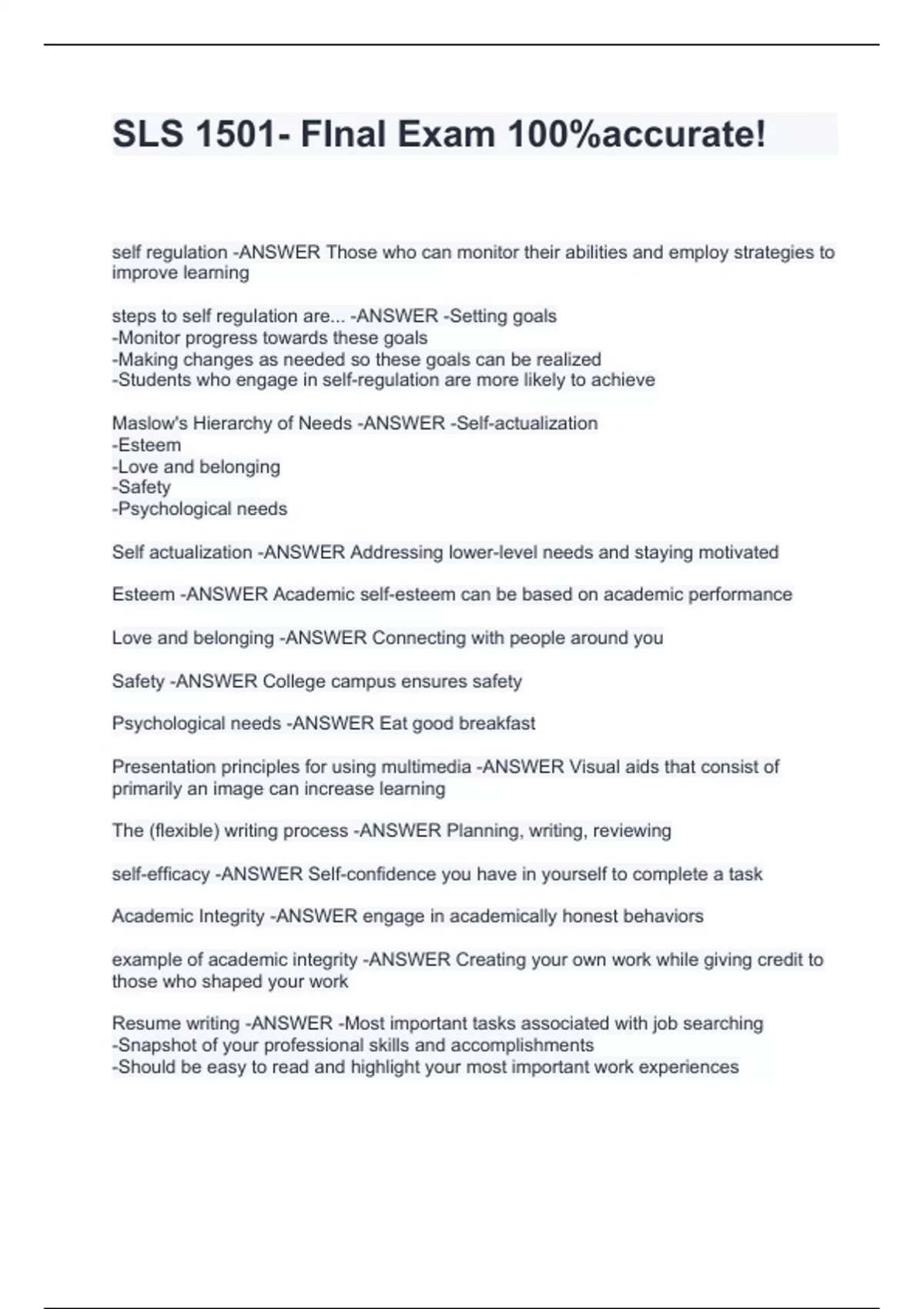 SLS 1501- FInal Exam 100%accurate! self regulation -ANSWER Those who can monitor their abilities and employ strategies to improve learning steps to self regulation are... -ANSWER -Setting goals -Monitor progress towards these goals -Making changes as needed so these goals can be realized -Students who engage in self-regulation are more likely to achieve Maslow's Hierarchy of Needs -ANSWER -Self-actualization -Esteem -Love and belonging -Safety -Psychological needs Self actualization -ANSWER Addressing lower-level needs and staying motivated Esteem -ANSWER Academic self-esteem can be based on academic performance Love and belonging -ANSWER Connecting with people around you Safety -ANSWER College campus ensures safety Psychological needs -ANSWER Eat good breakfast Presentation principles for using multimedia -ANSWER Visual aids that consist of primarily an image can increase learning The (flexible) writing process -ANSWER Planning, writing, reviewing self-efficacy -ANSWER Self-confidence you have in yourself to complete a task Academic Integrity -ANSWER engage in academically honest behaviors example of academic integrity -ANSWER Creating your own work while giving credit to tho