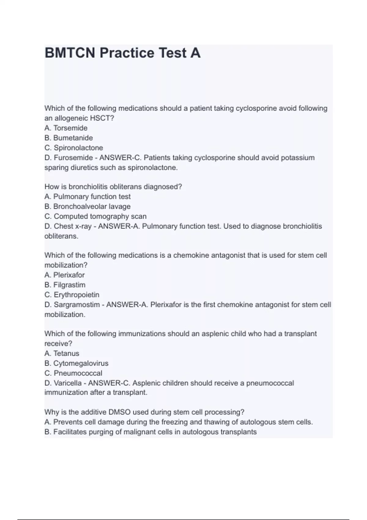 Which of the following medications should a patient taking cyclosporine avoid following an allogeneic HSCT? A. Torsemide B. Bumetanide C. Spironolactone D. Furosemide - ANSWER-C. Patients taking cyclosporine should avoid potassium sparing diuretics such as spironolactone. How is bronchiolitis obliterans diagnosed? A. Pulmonary function test B. Bronchoalveolar lavage C. Computed tomography scan D. Chest x-ray - ANSWER-A. Pulmonary function test. Used to diagnose bronchiolitis obliterans. Which of the following medications is a chemokine antagonist that is used for stem cell mobilization? A. Plerixafor B. Filgrastim C. Erythropoietin D. Sargramostim - ANSWER-A. Plerixafor is the first chemokine antagonist for stem cell mobilization. Which of the following im