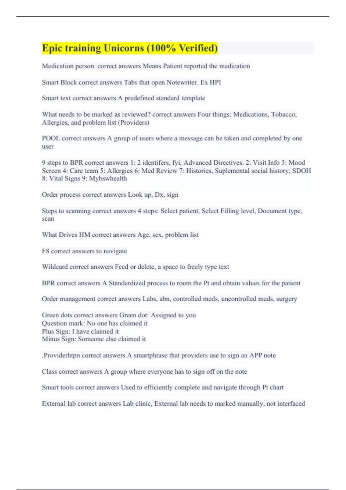Medication person. correct answers Means Patient reported the medication Smart Block correct answers Tabs that open Notewriter. Ex HPI Smart text correct answers A predefined standard template What needs to be marked as reviewed? correct answers Four things: Medications, Tobacco, Allergies, and problem list (Providers) POOL correct answers A group of users where a message can be taken and completed by one user 9 steps to BPR correct answers 1: 2 identifers, fyi, Advanced Directives. 2: Visit Info 3: Mood Screen 4: Care team 5: Allergies 6: Med Review 7: Histories, Suplemental social history, SDOH 8: Vital Signs 9: Mybswhealth Order process correct answers Look up, Dx, sign Steps to scanning correct answers 4 steps: Select patient, Select Filling level, Document type, scan What Drives HM correct answers Age, sex, problem list F8 correct answers to navigate Wildcard correct answers Feed or delete, a space to freely type text BPR correct answers A Standardized process to room the Pt and obtain values for the patient Order management correct answers Labs, abn, controlled meds, uncontrolled meds, surgery Green dots correct answers Green dot: Assigned to you Question mark: No one has claimed it Plus Sign: I have claimed it Minus Sign: Someone else claimed it .Providerhtpn correct answers A smartphrase that providers use to sign an APP note Class correct answers A group where everyone has to sign off on the note Smart tools correct answers Used to efficiently complete and navigate through Pt chart External lab correct answers Lab clinic, External lab needs to marked manually, not interfaced
