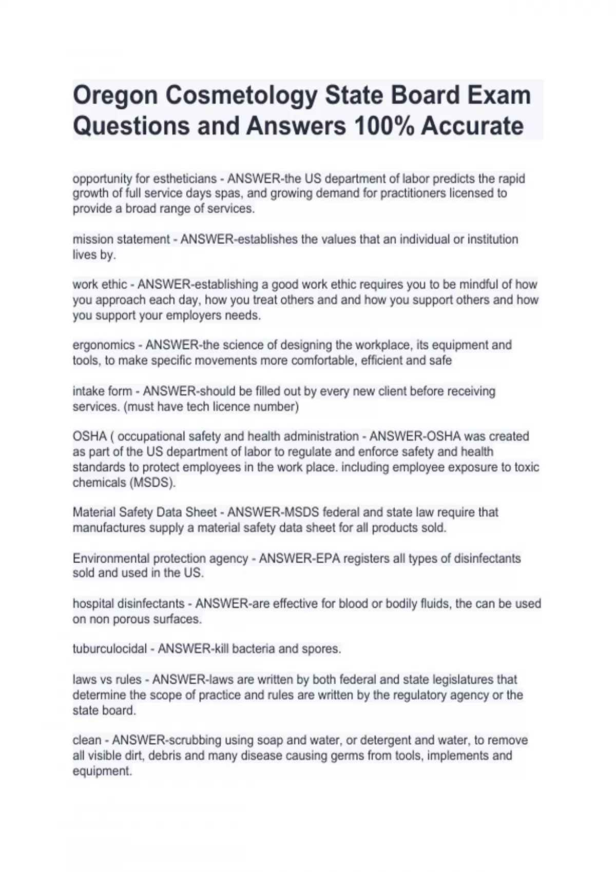 Oregon Cosmetology State Board Exam Questions and Answers 100% Accurate Oregon Cosmetology State Board Exam Questions and Answers 100% Accurate Oregon Cosmetology State Board Exam Questions and Answers 100% Accurate Oregon Cosmetology State Board Exam Questions and Answers 100% Accurate opportunity for estheticians - ANSWER-the US department of labor predicts the rapid growth of full service days spas, and growing demand for practitioners licensed to provide a broad range of services. mission statement - ANSWER-establishes the values that an individual or institution lives by. work ethic - ANSWER-establishing a good work ethic requires you to be mindful of how you approach each day, how you treat others and and how you support others and how you support your employers needs. ergonomics - ANSWER-the science of designing the workplace, its equipment and