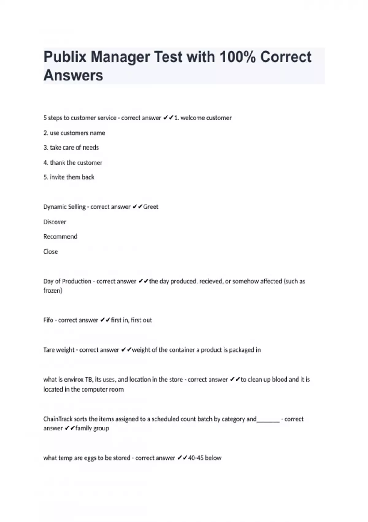 5 steps to customer service - correct answer 1. welcome customer 2. use customers name 3. take care of needs 4. thank the customer 5. invite them back Dynamic Selling - correct answer Greet Discover Recommend Close Day of Production - correct answer the day produced, recieved, or somehow affected (such as frozen) Fifo - correct answer first in, first out Tare weight - correct answer weight of the container a product is packaged in what is envirox TB, its uses, and location in the store - correct answer to clean up blood and it is located in the computer room ChainTrack sorts the items assigned to a scheduled count batch by category and_______ - correct answer family group w