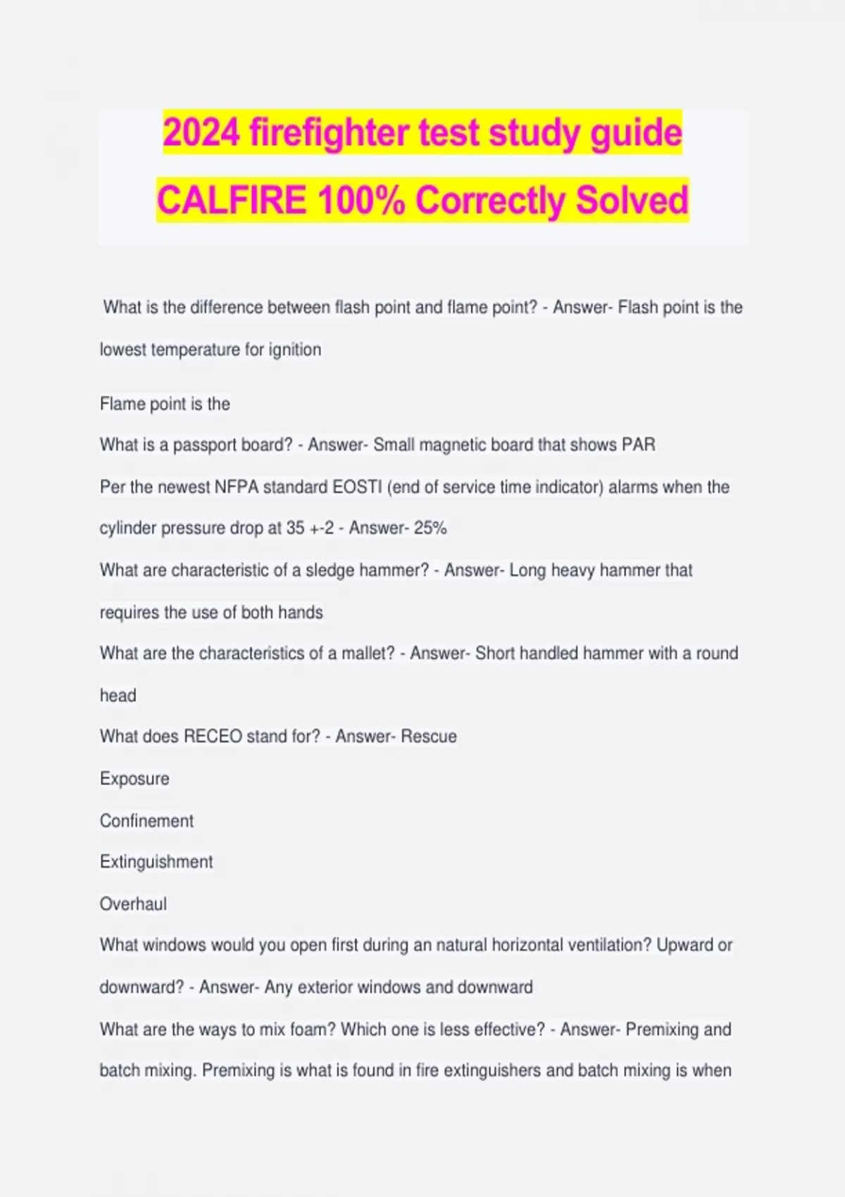 2024 firefighter test study guide CALFIRE 100% Correctly Solved What is the difference between flash point and flame point? - Answer- Flash point is the lowest temperature for ignition Flame point is the What is a passport board? - Answer- Small magnetic board that shows PAR Per the newest NFPA standard EOSTI (end of service time indicator) alarms when the cylinder pressure drop at 35 +-2 - Answer- 25% What are characteristic of a sledge hammer? - Answer- Long heavy hammer that requires the use of both hands What are the characteristics of a mallet? - Answer- Short handled hammer with a round head What does RECEO stand for? - Answer- Rescue Exposure Confinement Extinguishment Overhaul What windows would you open first during an natural horizontal ventilation? Upward or downward? - Answer- Any exterior windows and downward What are the ways to mix foam? Which one is less effective? - Answer- Premixing and batch mixing. Premixing is what is found in fire extinguishers and batch mixing is when