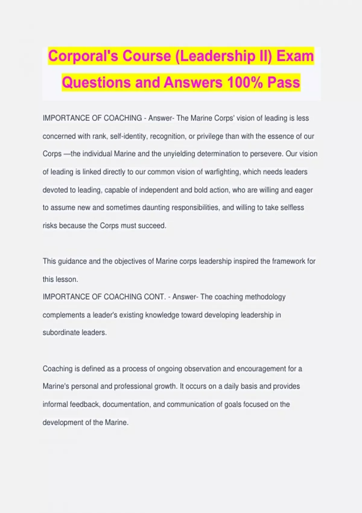 Corporal's Course (Leadership II) Exam Questions and Answers 100% Pass IMPORTANCE OF COACHING - Answer- The Marine Corps' vision of leading is less concerned with rank, self-identity, recognition, or privilege than with the essence of our Corps —the individual Marine and the unyielding determination to persevere. Our vision of leading is linked directly to our common vision of warfighting, which needs leaders devoted to leading, capable of independent and bold action, who are willing and eager to assume new and sometimes daunting responsibilities, and willing to take selfless risks because the Corps must succeed. This guidance and the objectives of Marine corps leadership inspired the framework for this lesson. IMPORTANCE OF COACHING CONT. - Answer- The coaching methodology complements a leader's existing knowledge toward developing leadership in subordinate leaders. Coaching is defined as a process of ongoing observation and encouragement for a Marine's personal and professional growth. It occurs on a daily basis and provides informal feedback, documentation, and communication of goals focused on the development of the Marine. Improved competence is the desired outcome of coaching. The coaching methodology uses interpersonal interaction to impart techniques and improve the recipient's ability to accomplish their goals. Coaching occurs whenever an individual provides a fellow Marine with the benefit of their experience. IMPORTANCE OF COACHING CONT. x3 - Answer- Coaching is a continuous process. It occurs during training while Marines show others how to perform actions during the course of their duties or the accomplishment of their missions. While Marines carry out tasks, coaching is applied to improve the efficiency and effectiveness of their work and simultaneously develop subordinate leaders confidence and knowledge base. The true value of any training is not so much the training itself, but the change in behavior that should result from learning. Performance is not so much about what you know as it is about what you do with what you know. CHARACTERISTICS - Answer- Coaching is a process that enhances potential in individuals to improve performance. It is about helping someone learn rather than drilling them on memorization. Coaching uses: •Hard leadership skills: -Goal setting -Reviewing performance •Soft leadership skills: -Believing in potential -Developing self-belief It is often about addressing the "attitude or motivation of an individual," which all too regularly limits their performance, progress, and potential. SETTING GOALS - Answer- Using the SMART method of setting goals empowers subordinate leaders to influence coaching outcomes. Additionally, developing goals should be treated as Marines treat mission statements. Therefore, include a proper in order to (IOT) at the end of your set goals. Characteristics of Goals: - Answer- •Specific: The goals must be clear (PT, education) •Measurable: Check progress and hold accountable •Attainable: Relevant, manageable, and challenging •Realistic: Tools and abilities to accomplish •Timely: Provides focus and accountability REVIEWING PERFORMANCE - Answer- After you create and document SMART goals with a plan for reaching them, engaged leadership becomes easier and more focused. Assessing progress is where small unit leaders truly get to know and understand their Marines. By using a recommended goals form or a locally produced version, documenting these SMART goals sets a standard of assessment. Additionally, leaders have the opportunity to ensure these goals are balanced against all other competing factors of their Marines' time. The foundational key to setting and meeting these goals centers on the fact that the Marine is in control of achieving them. If adjustments to existing goals need to be made, leaders are involved in reinforcing or advising the adjustments. "Equipment is useful only if it improves combat effectiveness" MCDP-1 BELIEVING IN POTENTIAL - Answer- Coaching is not a short-term fix; it is a long-term solution to help a person unlock their true potential and maximize their own performance through instilling confidenc