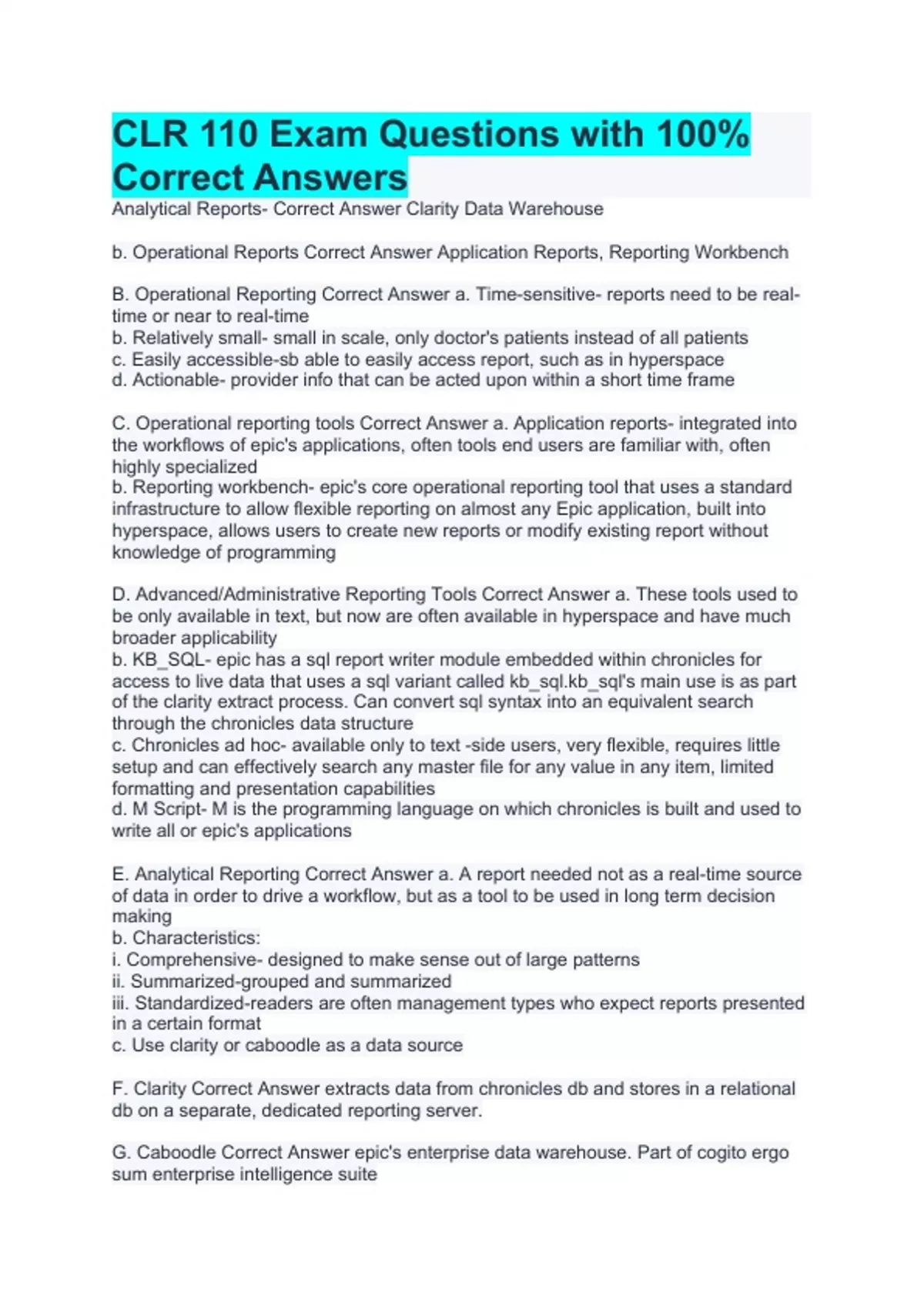 Analytical Reports- Correct Answer Clarity Data Warehouse b. Operational Reports Correct Answer Application Reports, Reporting Workbench B. Operational Reporting Correct Answer a. Time-sensitive- reports need to be real-time or near to real-time b. Relatively small- small in scale, only doctor's patients instead of all patients c. Easily accessible-sb able to easily access report, such as in hyperspace d. Actionable- provider info that can be acted upon within a short time frame C. Operational reporting tools Correct Answer a. Application reports- integrated into the workflows of epic's applications, often tools end users are familiar with, often highly specialized b. Reporting workbench- epic's core operational reporting tool that uses a standard infrastructure to allow flexible reporting on almost any Epic application, built into hyperspace, allows users to create new reports or modify existing report without knowledge of programming D. Advanced/Administrative Reporting Tools Correct Answer a. These tools used to be only available in text, but now are often available in hyperspace and have much broader applicability b. KB_SQL- epic has a sql report writer module embedded within chronicles for access to live data that uses a sql variant called kb__sql's main use is as part of the clarity extract process. Can convert sql syntax into an equivalent search through the chronicles data structure c. Chronicles ad hoc- available only to text -side users, very flexible, requires little setup and can effectively search any master file for any value in any item, limited formatting and presentation capabilities d. M Script- M is the programming language on which chronicles is built and used to write all or epic's applications E. Analytical Reporting Correct Answer a. A report needed not as a real-time source of data in order to drive a workflow, but as a tool to be used in long term decision making b. Characteristics: i. Comprehensive- designed to make sense out of large patterns ii. Summarized-grouped and summarized iii. Standardized-readers are often management types who expect reports presented in a certain format c. Use clarity or caboodle as a data source F. Clarity Correct Answer extracts data from chronicles db and stores in a relational db on a separate, dedicated reporting server. G. Caboodle Correct Answer epic's enterprise data warehouse. Part of cogito ergo sum enterprise intelligence suite