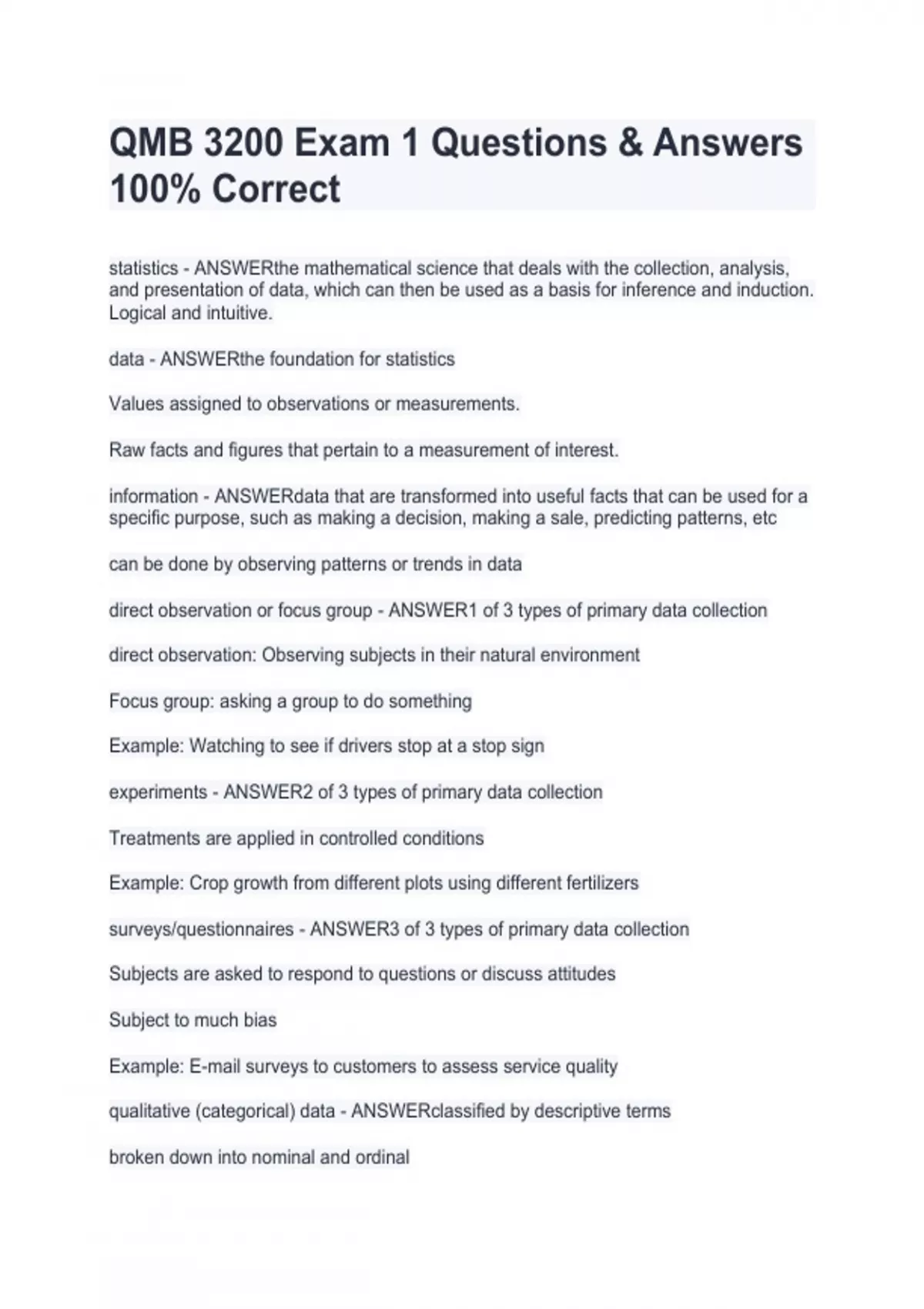 QMB 3200 Exam 1 Questions & Answers 100% Correct QMB 3200 Exam 1 Questions & Answers 100% Correct QMB 3200 Exam 1 Questions & Answers 100% Correct QMB 3200 Exam 1 Questions & Answers 100% Correct statistics - ANSWERthe mathematical science that deals with the collection, analysis, and presentation of data, which can then be used as a basis for inference and induction. Logical and intuitive. data - ANSWERthe foundation for statistics Values assigned to observations or measurements.