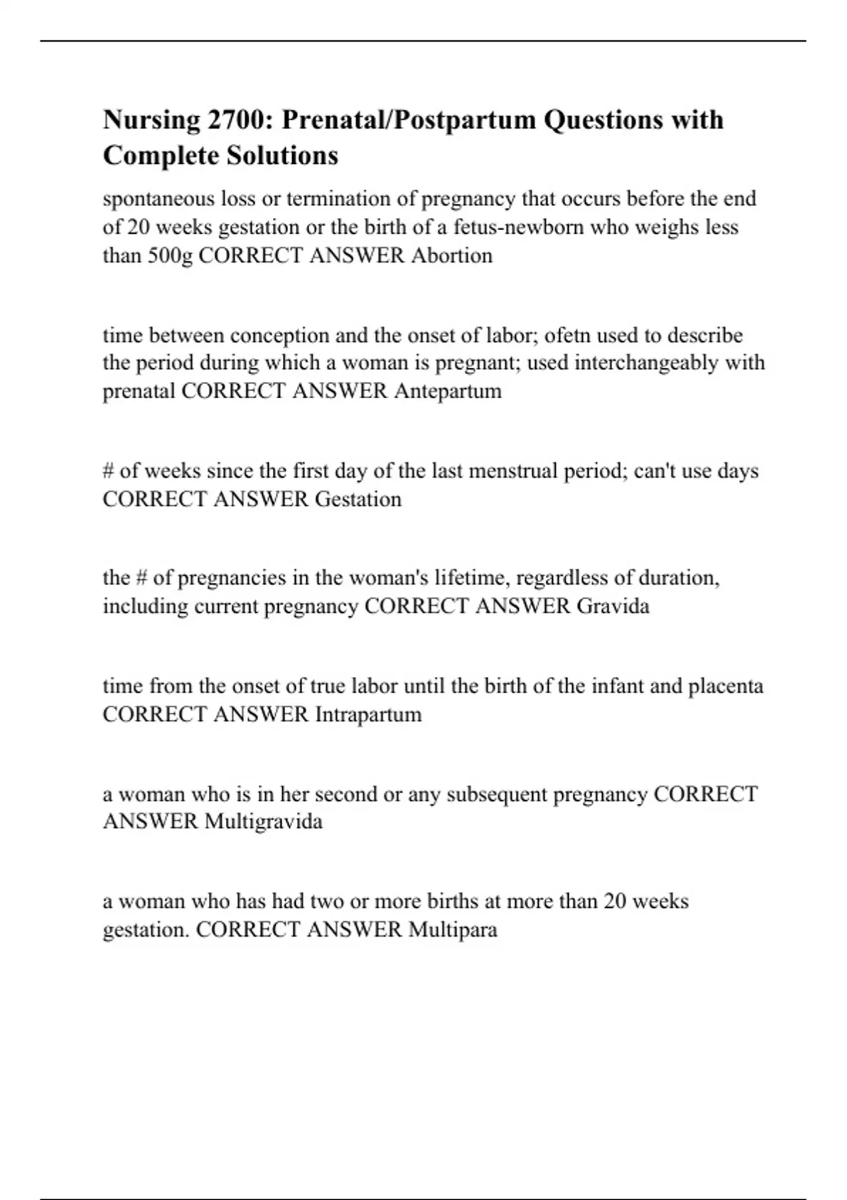 Nursing 2700: Prenatal/Postpartum Questions with Complete Solutions