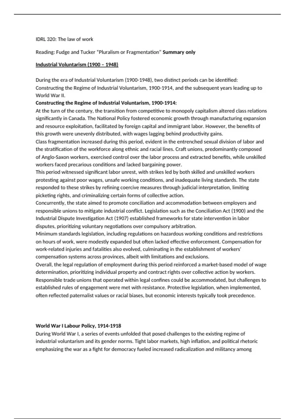 Summary of one of the readings from course IDRL 320 from Athabasca University "Pluralism or fragmentation? The twentieth-century employment law regime in Canada" by Judy Fudge and Eric Tucker