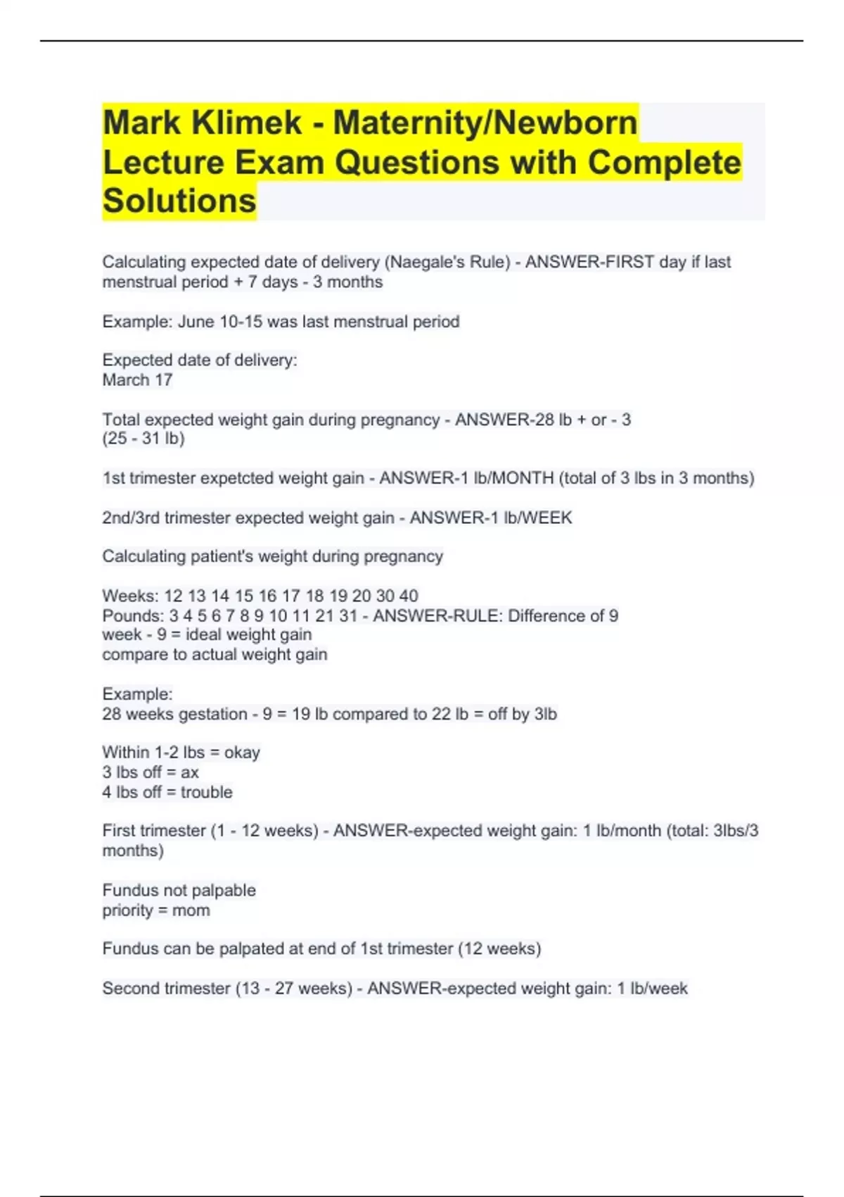 Mark Klimek - Maternity/Newborn Lecture Exam Questions with Complete Solutions