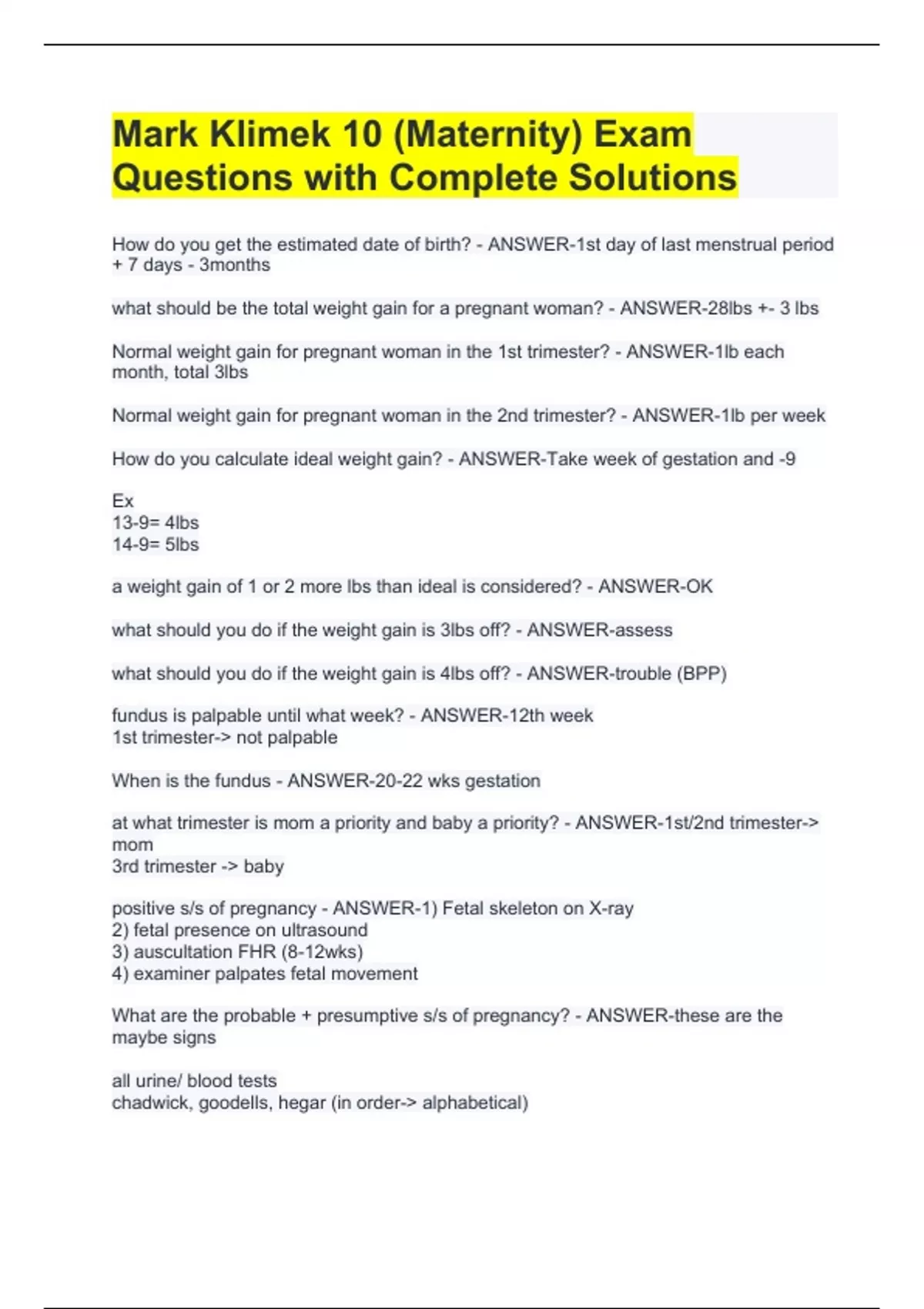 Mark Klimek 10 (Maternity) Exam Questions with Complete Solutions