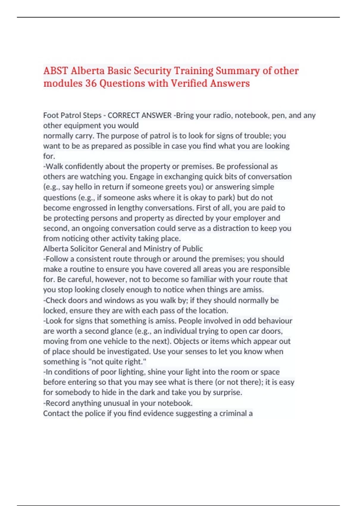ABST Alberta Basic Security Training Summary of other modules 36 Questions with Verified Answers,100% CORRECT