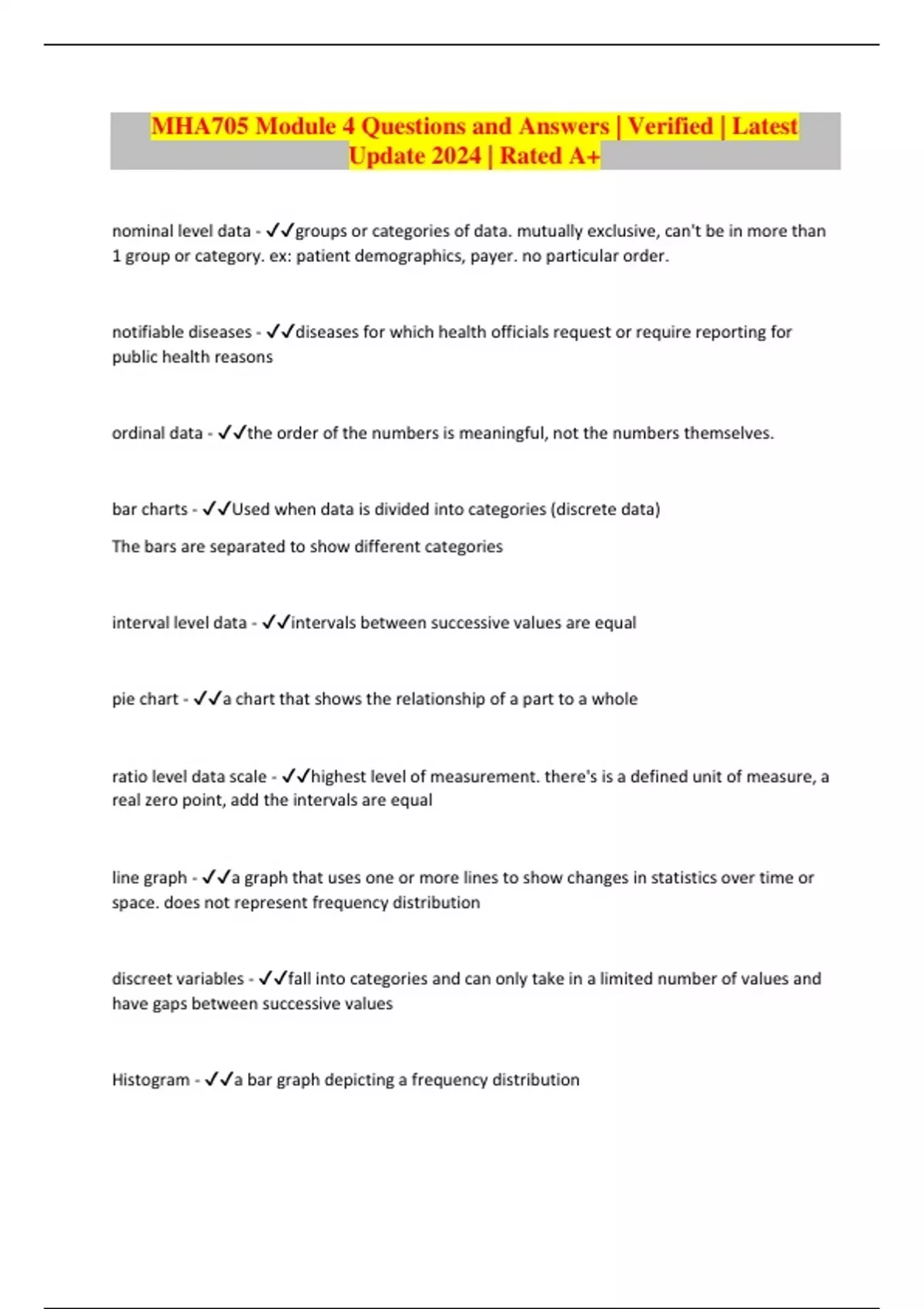 MHA705 Module 4 Questions and Answers | Verified | Latest Update 2024 | Rated A+ nominal level data - groups or categories of data. mutually exclusive, can't be in more than 1 group or category. ex: patient demographics, payer. no particular order. notifiable diseases - diseases for which health officials request or require reporting for public health reasons ordinal data - the order of the numbers is meaningful, not the numbers themselves. bar charts - Used when data is divided into categories (discrete data) The bars are separated to show different categories interval level data - intervals between successive values are equal pie chart - a chart that shows the relationship of a part to a whole ratio level data scale - highest level of measurement. there's is a defined unit of measure, a real zero point, add the intervals are equal line graph - a graph that uses one or more lines to show changes in statistics over time or space. does not represent frequency distribution discreet variables - fall into categories and can only take in a limited number of values and have gaps between successive values