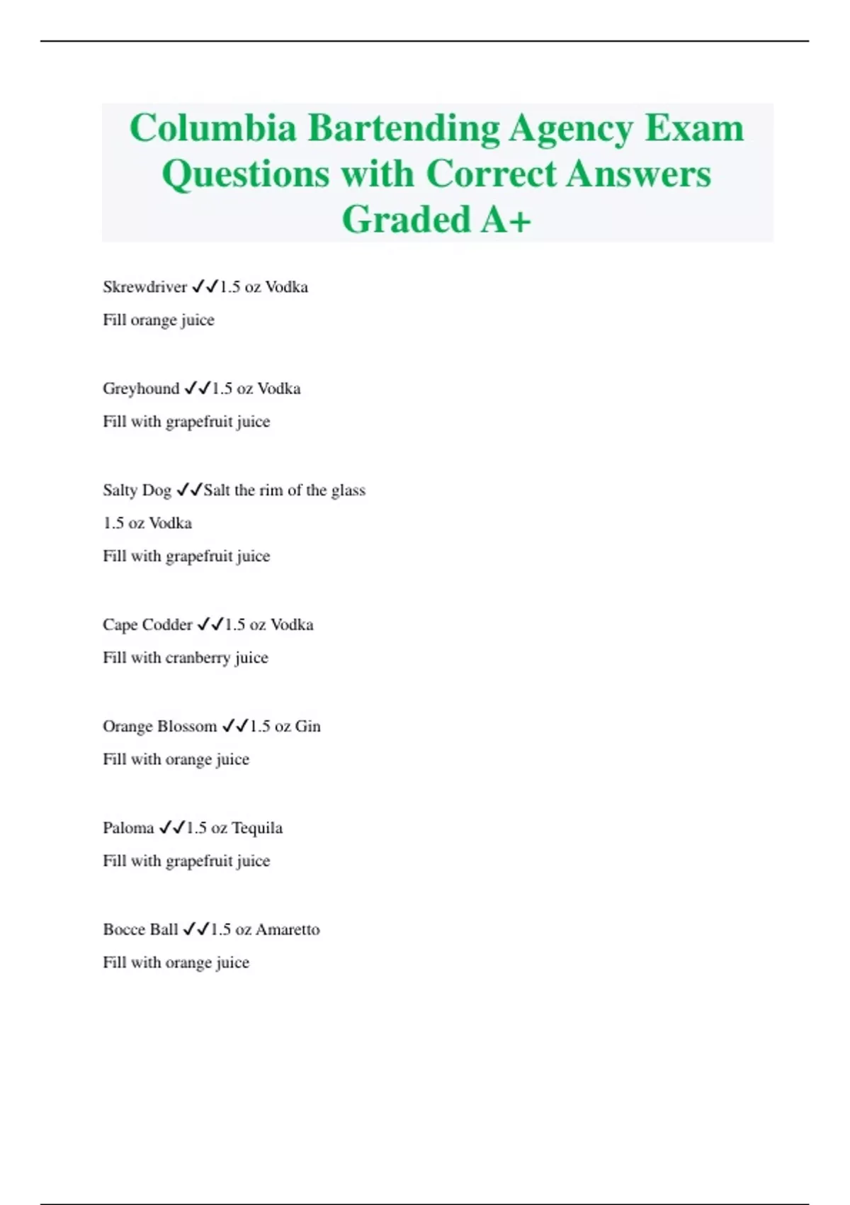 Columbia Bartending Agency Exam Questions with Correct Answers Graded A+