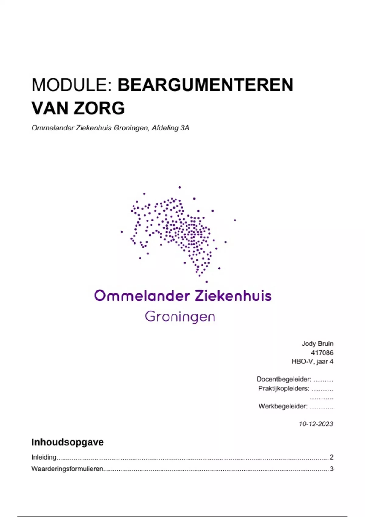 Deze module Beargumenteren van zorg is gemaakt in de PLP3 in het studiejaar . De setting waarin de module is gemaakt is in het ziekenhuis (OZG, afdeling 3A hart/long/neuro). Het bestand bevat het portfolio waarin de module ingeleverd moet worden. De waarderingsformulieren en reflectieverslagen zijn wel afgeschermd. Deze module is beoordeeld met een 7.8