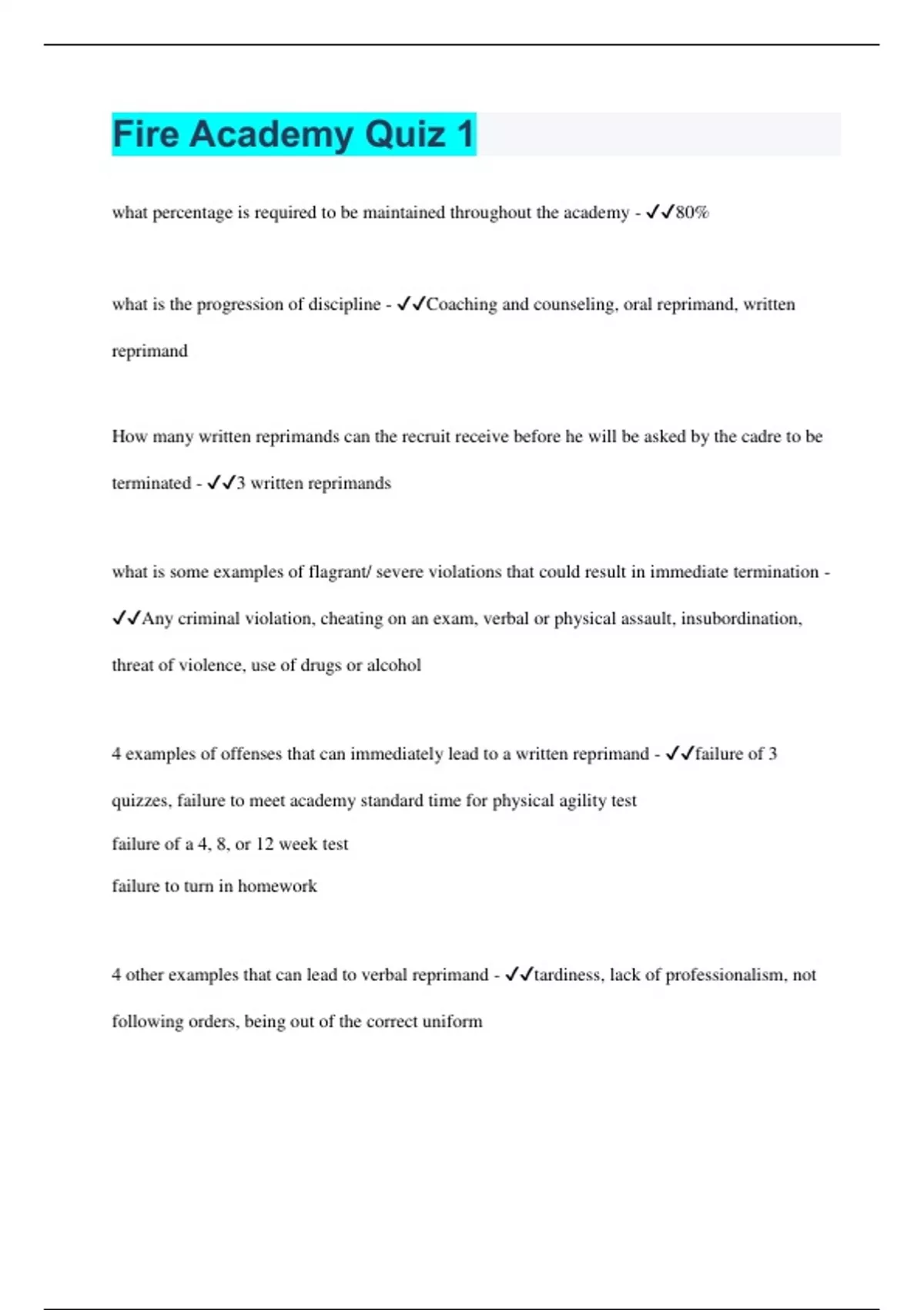 Fire Academy Quiz 1 what percentage is required to be maintained throughout the academy - 80% what is the progression of discipline - Coaching and counseling, oral reprimand, written reprimand How many written reprimands can the recruit receive before he will be asked by the cadre to be terminated - 3 written reprimands what is some examples of flagrant/ severe violations that could result in immediate termination - Any criminal violation, cheating on an exam, verbal or physical assault, insubordination, threat of violence, use of drugs or alcohol 4 examples of offenses that can immediately lead to a written reprimand - failure of 3 quizzes, failure to meet academy standard time for physical agility test failure of a 4, 8, or 12 week test failure to turn in homework 4 other examples that can lead to verbal reprimand - tardiness, lack of professionalism, not following orders, being out of the correct uniform Coaching def - a teaching or training process in which an individual gets support while learning to achieve a specific professional result or goal Counseling def - a meeting between a supervisor and employee. it may focus on a specific work place incident, or in as the result of performance evaluation. oral reprimand - a disciplinary discussion between a management official who has authority to take disciplinary action and his/her employee in which the employee is informed that he/she has been disciplined by receipt of an oral admonishment or oral reprimand. what does a recruit have to provide to the cadre in order to miss a day of the academy - a letter from a physician How long do you have to heal if you are injured outside of the academy - 1 week How long do you have to heal if you are injured inside of the academy - 3 weeks what are the 7 reasons that you can have an excused absence - illness with physicians note, hospitalization, jury duty, subpoenas, military active duty, funeral of immediate family, military reserve training What defines a tardy - nor being present within the 1 minute of the designated start time how many tardies does it take to result in a written reprimand - 2 tardies 1st reason why firefighters get fired - poor physical conditioning 2nd reason why firefighters get fired - immaturity 3rd reason why firefighters get fired - injury 4th reason why firefighters get fired - Background