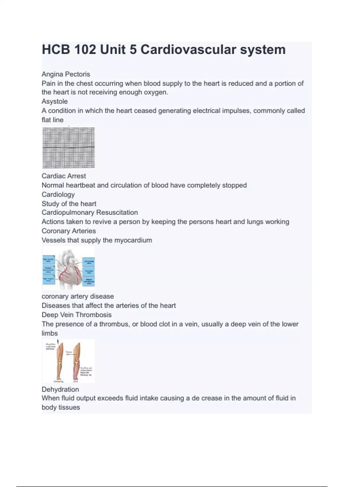Angina Pectoris Pain in the chest occurring when blood supply to the heart is reduced and a portion of the heart is not receiving enough oxygen. Asystole A condition in which the heart ceased generating electrical impulses, commonly called flat line Cardiac Arrest Normal heartbeat and circulation of blood have completely stopped Cardiology Study of the heart Cardiopulmonary Resuscitation Actions taken to revive a person by keeping the persons heart and lungs working Coronary Arteries Vessels that supply the myocardium coronary artery disease Diseases that affect the arteries of the heart Deep Vein Thrombosis The presence of a thrombus, or blood clot in a vein, usually a deep vein of the lower limbs Dehydration When fluid output excee