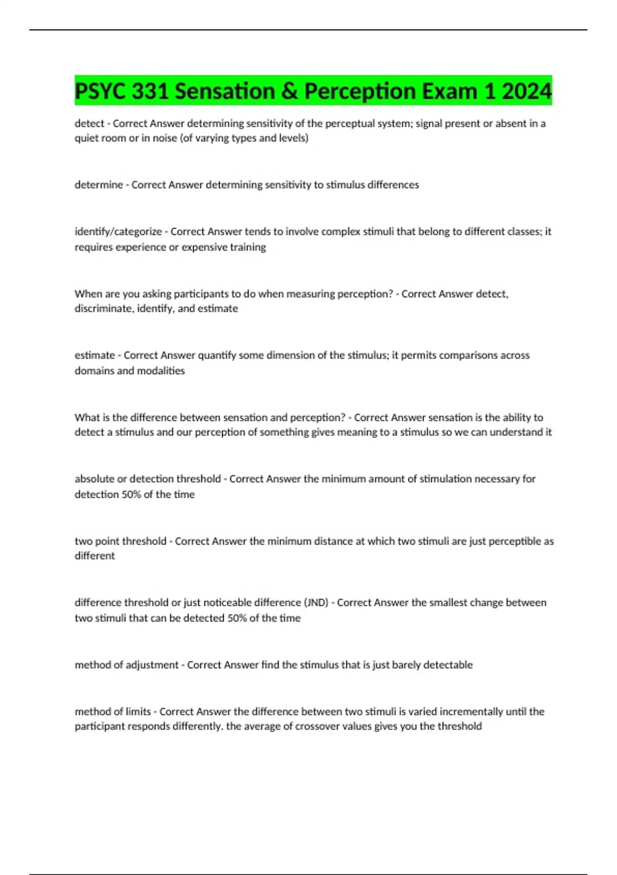 PSYC 331 Sensation & Perception Exam 1 2024 detect - Correct Answer determining sensitivity of the perceptual system; signal present or absent in a quiet room or in noise (of varying types and levels) determine - Correct Answer determining sensitivity to stimulus differences identify/categorize - Correct Answer tends to involve complex stimuli that belong to different classes; it requires experience or expensive training When are you asking participants to do when measuring perception? - Correct Answer detect, discriminate, identify, and estimate estimate - Correct Answer quantify some dimension of the stimulus; it permits comparisons across domains and modalities What is the difference between sensation and perception? - Correct Answer sensation is the ability to detect a stimulus and our perception of something gives meaning to a stimulus so we can understand it absolute or detection threshold - Correct Answer the minimum amount of stimulation necessary for detection 50% of the time two point threshold - Correct Answer the minimum distance at which two stimuli are just perceptible as different difference threshold or just noticeable difference (JND) - Correct Answer the smallest change between two stimuli that can be detected 50% of the time method of adjustment - Correct Answer find the stimulus that is just barely detectable method of limits - Correct Answer the difference between two stimuli is varied incrementally until the participant responds differently. the average of crossover values gives you the threshold method of constant stimuli - Correct Answer when many different of stimuli, ranging from rarely to almost perceivable, are presented at one time. participants respond with yes/no, same/different, etc. What are the three psychophysical methods? - Correct Answer method of constant stimuli, method of adjustment, and method of limits How do you use an adaptive staircase in finding a threshold? - Correct Answer if the answer is wrong, it gets easier; if the answer is right again, it gets harder (reversal) Gustav Fechner - Correct Answer sometimes considered to be the true founder of experimental psychology dualism - Correct Answer the idea that the mind has an existence separate from the material world of the body materialism - Correct Answer the idea that the only thing that exists is matter, and that all things, including the mind and consciousness, are the results of interaction between bits of matter panpsychism - Correct Answer the idea that the mind exists as a property of all matter; that is, that all matter has consciousness psychophysics - Correct Answer defining quantitative relationships between physical and psychological events Weber fraction - Correct Answer the constant of proportionality in Weber's law Weber's law - Correct Answer the JND is a constant proportion of stimulus level Fechner's law - C