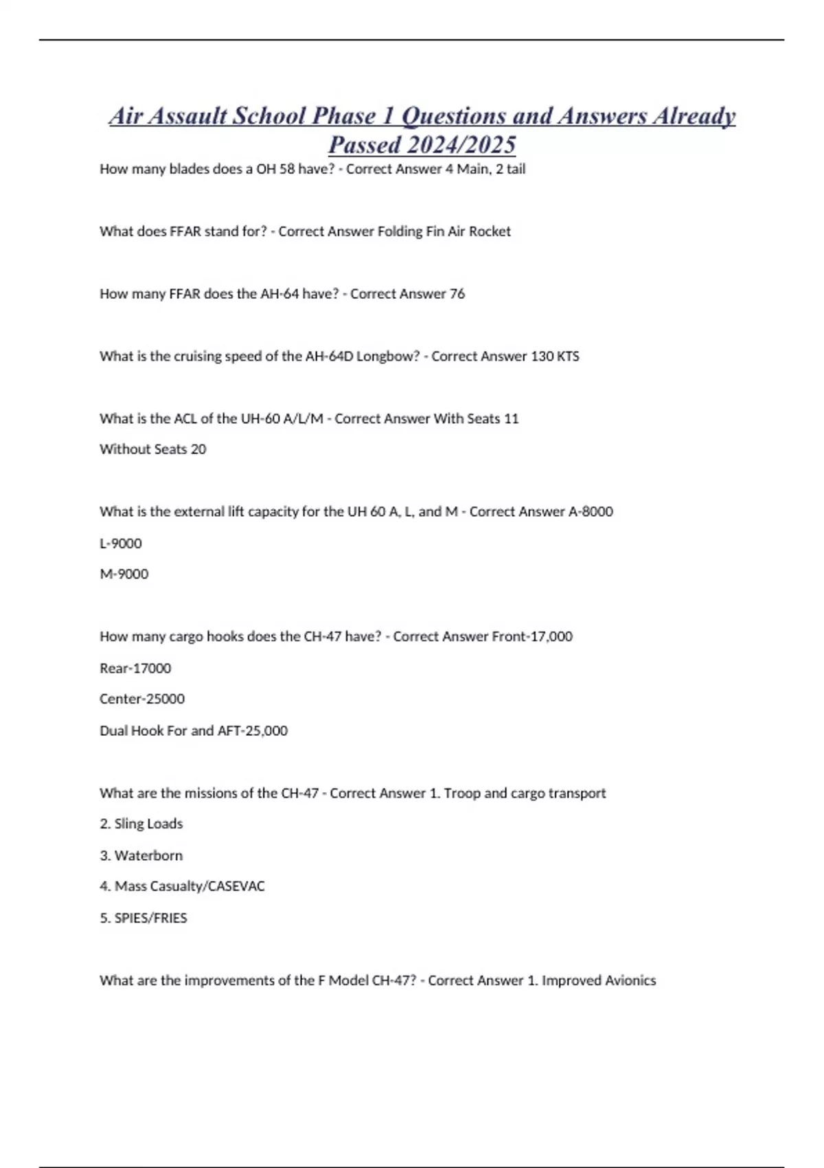 Air Assault School Phase 1 Questions and Answers Already Passed 2024/2025 How many blades does a OH 58 have? - Correct Answer 4 Main, 2 tail What does FFAR stand for? - Correct Answer Folding Fin Air Rocket How many FFAR does the AH-64 have? - Correct Answer 76 What is the cruising speed of the AH-64D Longbow? - Correct Answer 130 KTS What is the ACL of the UH-60 A/L/M - Correct Answer With Seats 11 Without Seats 20 What is the external lift capacity for the UH 60 A, L, and M - Correct Answer A-8000 L-9000 M-9000 How many cargo hooks does the CH-47 have? - Correct Answer Front-17,000 Rear-17000 Center-25000 Dual Hook For and AFT-25,000 What are the missions of the CH-47 - Correct Answer 1. Troop and cargo transport 2. Sling Loads 3. Waterborn 4. Mass Casualty/CASEVAC 5. SPIES/FRIES What are the improvements of the F Model CH-47? - Correct Answer 1. Improved Avionics