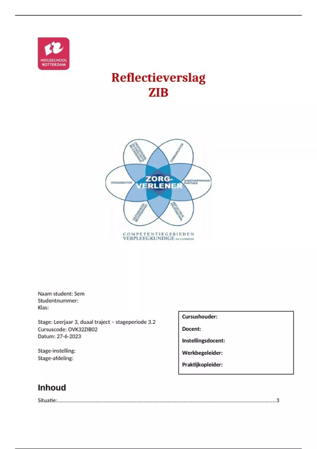 Dit document bevat de volledige uitwerking van het vak Zorg In Beweging (ZIB) volgens het beoordelingsformulier. Beoordeeld met een 7.