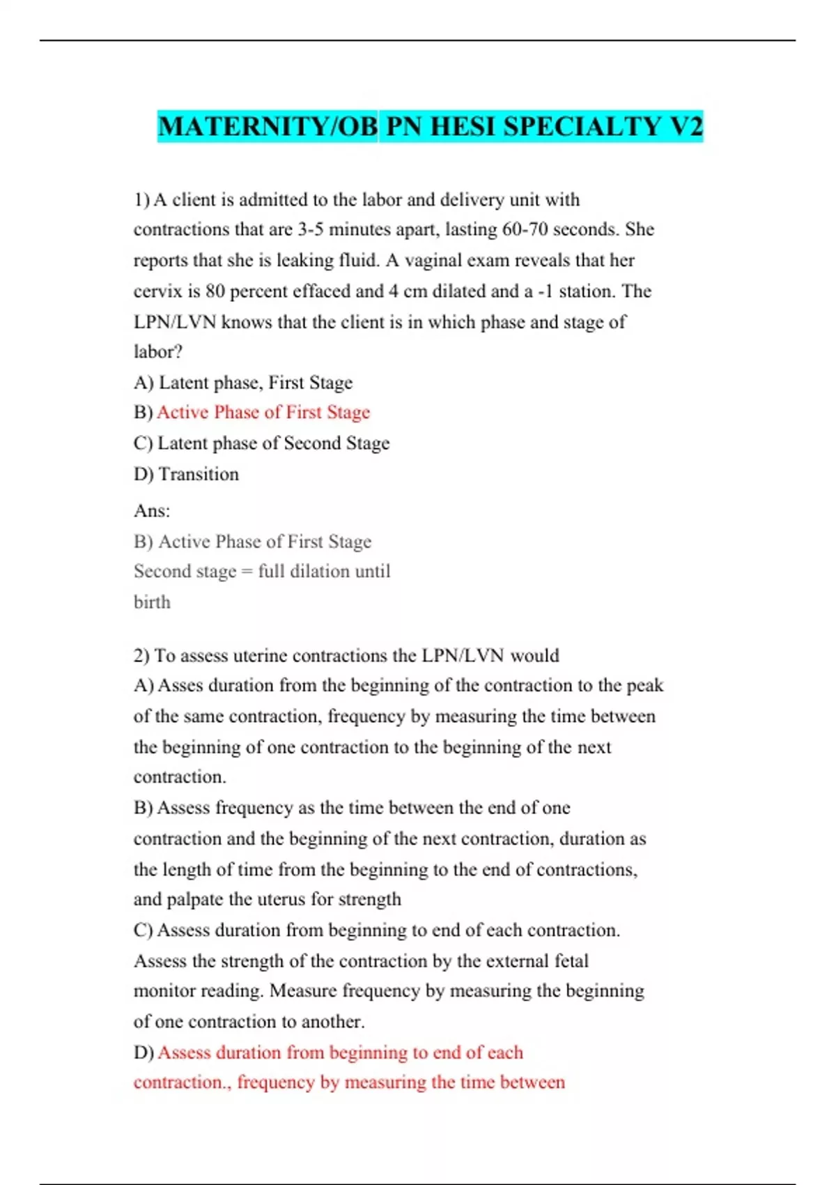MATERNITY/OB PN HESI SPECIALTY V2 1) A client is admitted to the labor and delivery unit with contractions that are 3-5 minutes apart, lasting 60-70 seconds. She reports that she is leaking fluid. A vaginal exam reveals that her cervix is 80 percent effaced and 4 cm dilated and a -1 station. The LPN/LVN knows that the client is in which phase and stage of labor? A) Latent phase, First Stage B) Active Phase of First Stage C) Latent phase of Second Stage D) Transition Ans: B) Active Phase of First Stage Second stage = full dilation until birth 2) To assess uterine contractions the LPN/LVN would A) Asses duration from the beginning of the contraction to the peak of the same contraction, frequency by measuring the time between the beginning of one contraction to the beginning of the next contraction. B) Assess frequency as the time between the end of one contraction and the beginning of the next contraction, duration as the length of time from the beginning to the end of contractions, and palpate the uterus for strength C) Assess duration from beginning to end of each contraction. Assess the strength of the contraction by the external fetal monitor reading. Measure frequency by measuring the beginning of one contraction to another. D) Assess duration from beginning to end of each contraction., frequency by measuring the time between the beginnings of