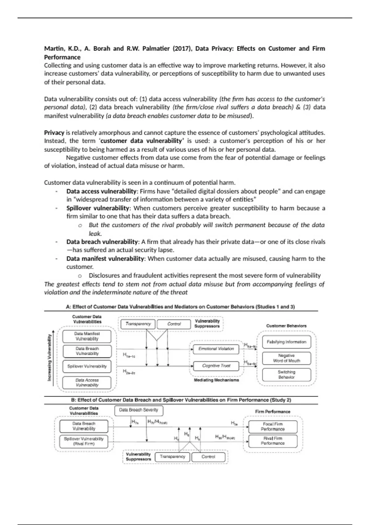 Summary of the 3 articles of week 2 of MCEV, for RUG-students. The summarized articles are: Martin, K.D., A. Borah and R.W. Palmatier (2017), Data Privacy: Effects on Customer and Firm Performance, Journal of Marketing, 81 (1), 36-58. Mende, M., Scott, M. L., van Doorn, J., Grewal, D., & Shanks, I. (2019). Service robots rising: How humanoid robots influence service experiences and elicit compensatory consumer responses. Journal of Marketing Research, 56(4), 535-556. Van Doorn, J. and J.C. Hoekstra (2013), Customization of Online Advertising: The Role of Intrusiveness, Marketing Letters, 24 (4), 339-351. Summary of the other weeks are also available.