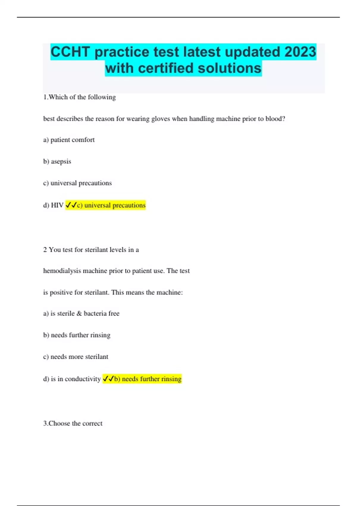 CCHT practice test latest updated 2023 with certified solutions 1.Which of the following best describes the reason for wearing gloves when handling machine prior to blood? a) patient comfort b) asepsis c) universal precautions d) HIV c) universal precautions 2 You test for sterilant levels in a hemodialysis machine prior to patient use. The test is positive for sterilant. This means the machine: a) is sterile & bacteria free b) needs further rinsing c) needs more sterilant d) is in conductivity b) needs further rinsing