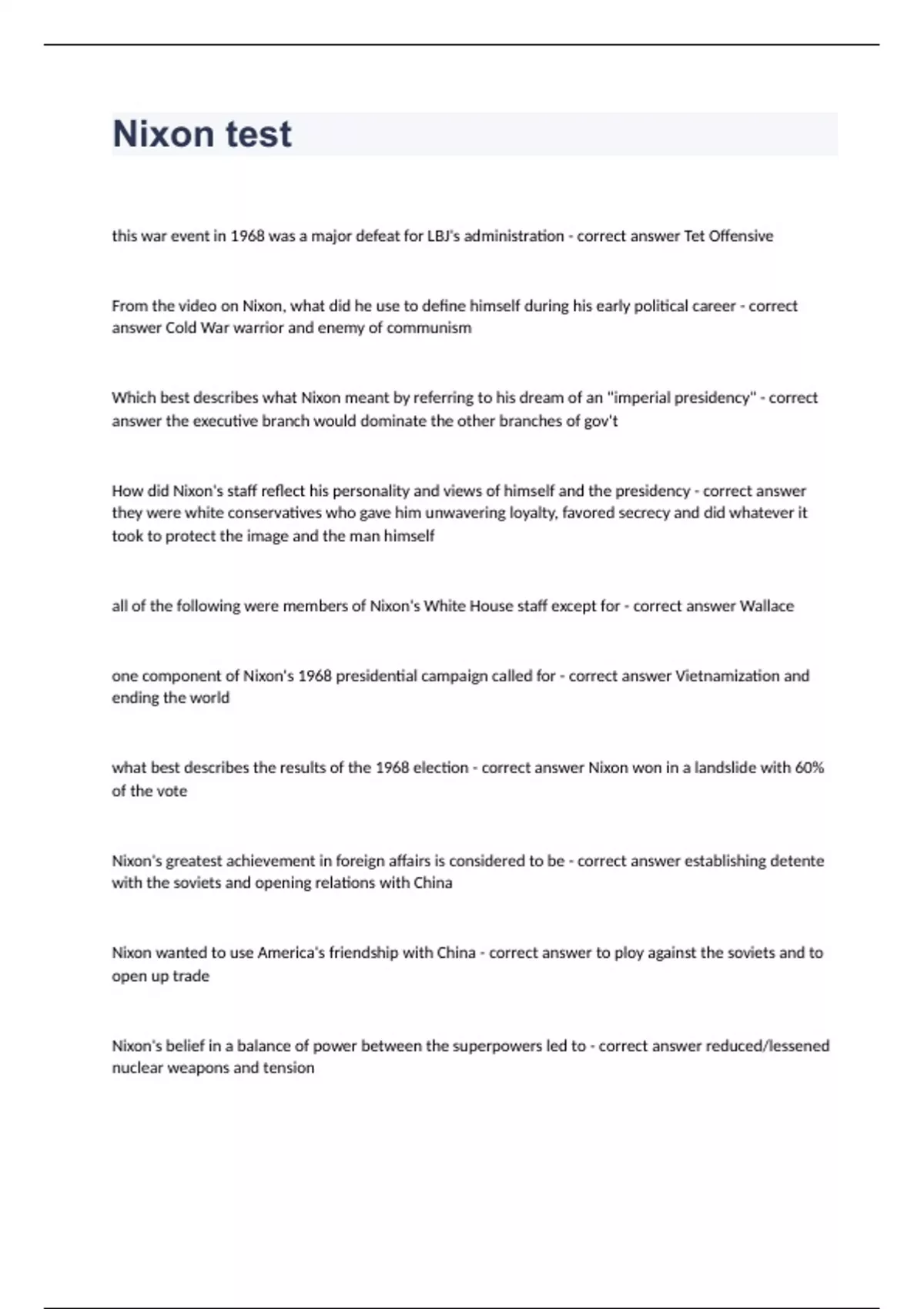 Nixon test Question and answer correctly solved 2024this war event in 1968 was a major defeat for LBJ's administration - correct answer Tet Offensive From the video on Nixon, what did he use to define himself during his early political career - correct answer Cold War warrior and enemy of communism Which best describes what Nixon meant by referring to his dream of an "imperial presidency" - correct answer the executive branch would dominate the other branches of gov't How did Nixon's staff reflect his personality and views of himself and the presidency - correct answer they were white conservatives who gave him unwavering loyalty, favored secrecy and did whatever it took to protect the image and the man himself all of the following were members of Nixon's White House staff except for - correct answer Wallace one component of Nixon's 1968 presidential campaign called for - correct answer Vietnamization and ending the world what best describes the results of the 1968 election - correct answer Nixon won in a landslide with 60% of the vote Nixon's greatest