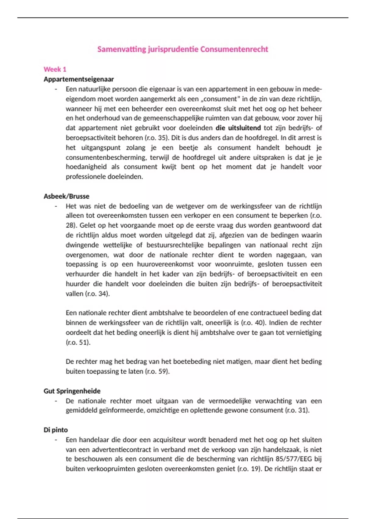 Samenvatting jurisprudentie Consumentenrecht