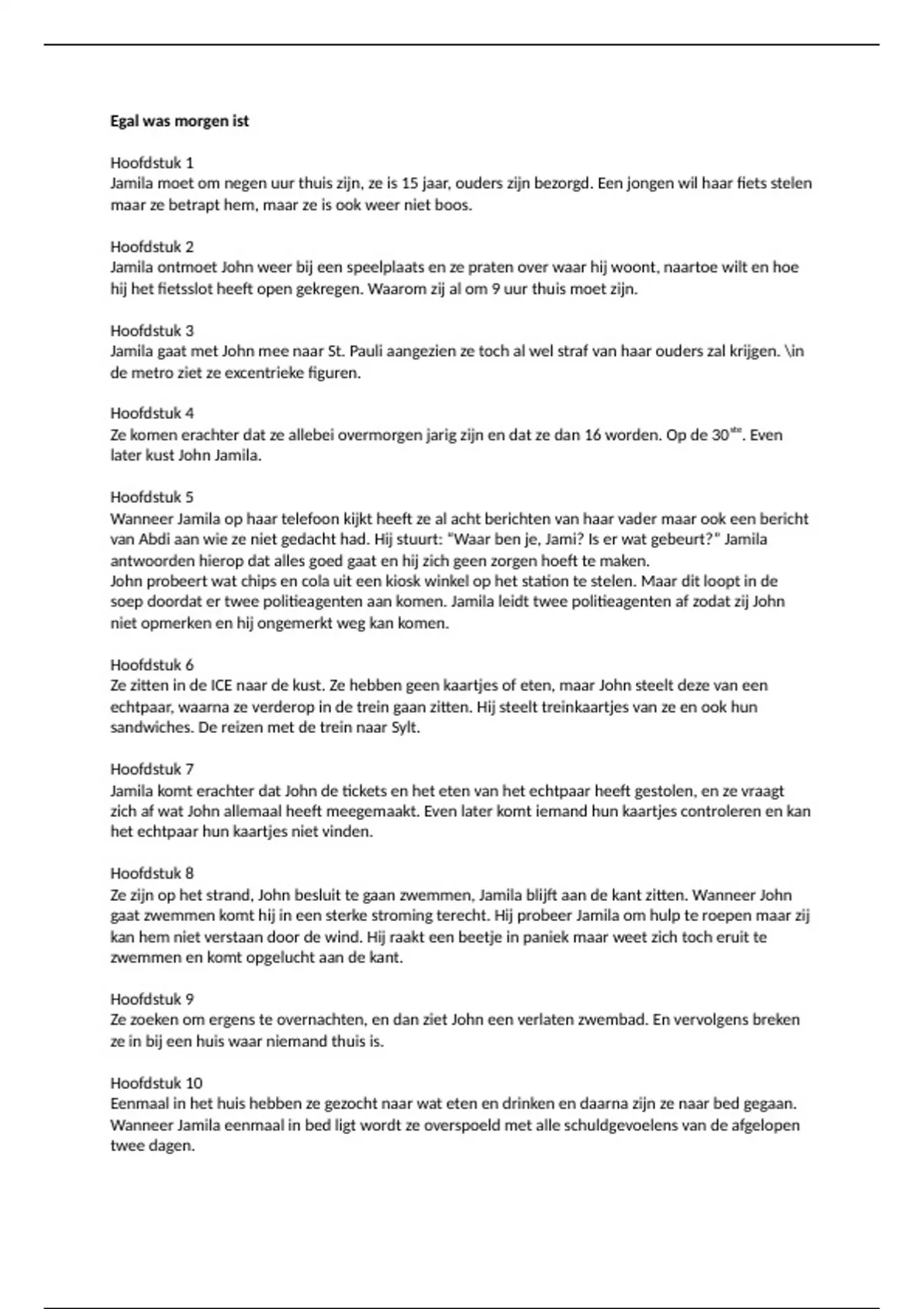 In deze samenvatting van twee pagina's vindt je per hoofdstuk kort een samenvatting of kern van het hoofdstuk van het boek Egal was morgen ist. De samenvatting is gemaakt voor een boektoets. Met deze samenvatting heb ik een voldoende gehaald voor de toets. De tekst staat in een word document getypt en is dus goed leesbaar.