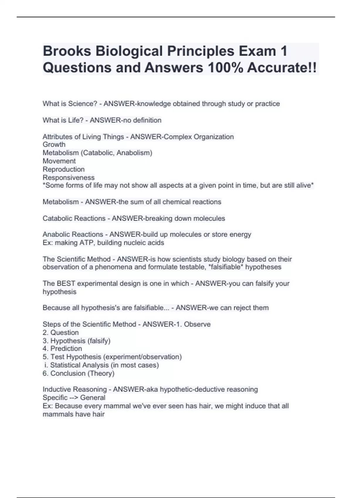 Brooks Biological Principles Exam 1 Questions and Answers 100% Accurate!!What is Science? - ANSWER-knowledge obtained through study or practice What is Life? - ANSWER-no definition Attributes of Living Things - ANSWER-Complex Organization Growth Metabolism (Catabolic, Anabolism) Movement Reproduction Responsiveness *Some forms of life may not show all aspects at a given point in time, but are still alive* Metabolism - ANSWER-the sum of all chemical reactions Catabolic Reactions - ANSWER-breaking down molecules Anabolic Reactions - ANSWER-build up molecules or store energy Ex: making ATP, building nucleic acids The Scientific Method - ANSWER-is how scientists study biology based on their observation of a phenomena and formulate testable, *falsifiable* hypotheses The BEST experimental design is one in which - ANSWER-you can falsify your hypothesis Because all hypothesis's are falsifiable... - ANSWER-we can reject them Steps of the Scientific Method - ANSWER-1. Observe 2. Question 3. Hypothesis (falsify) 4.