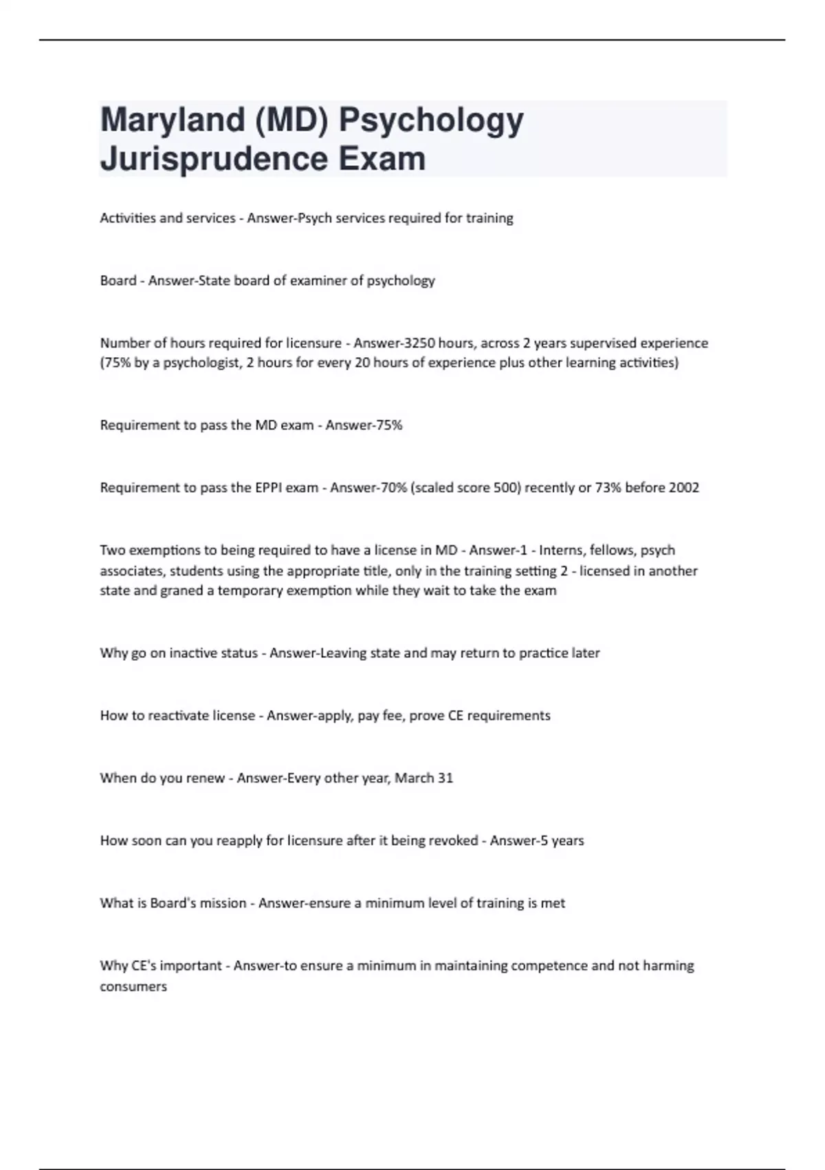 Maryland (MD) Psychology Jurisprudence Exam Activities and services - Answer-Psych services required for training Board - Answer-State board of examiner of psychology Number of hours required for licensure - Answer-3250 hours, across 2 years supervised experience (75% by a psychologist, 2 hours for every 20 hours of experience plus other learning activities) Requirement to pass the MD exam - Answer-75% Requirement to pass the EPPI exam - Answer-70% (scaled score 500) recently or 73% before 2002 Two exemptions to being required to have a license in MD - Answer-1 - Interns, fellows, psych associates, students using the appropriate title, only in the training setting 2 - licensed in another state and graned a temporary exemption while they wait to take the exam Why go on inactive status - Answer-Leaving state and may return to practice later How to reactivate license - Answer-apply, pay fee, prove CE requirements When do you renew - Answer-Every other year, March 31 How soon can you reapply for licensure after it being revoked - Answer-5 years What is Board's mission - Answer-ensure a minimum level of training is met Why CE's important - Answer-to ensure a minimum in maintaining competence and not harming consumersWhat are goals of CE's (4 goals, 3 nos) - Answer-1 - maintain professional competency 2- increase professional skills and knowledge 3 - prepare for new roles and responsibilities in practice 4 - expands the science of psych theory, method, or practice NOS: business meetings, professional committee meetings, presentations/publications for a lay audience What are CE requirements - Answer-40 CE's per 2 years. (Max 20 independent study (APA approved), minimum 3 ethics / law / risk management, minimum 3 cultural competence/diversity, maximum 30 hours for scholarly activities). Goes on cycle ending March 31. Have to keep proof in case of audit. What kind of CE documentation is necessary - Answer-Reprints, transcript and course syllabi, test and certificate of completion for independent study or workshops. Keep for 4 years. What CE hours are earned for scholarly activities - Answer-Only earned by first 3 authors. Authoring, editing, presenting or revising a publication. 20 hours for a book. 15 for Editor of a book, author of a book chapter, author of a journal article. 15 for service as Editor or Associate Editor of a journal. 15 for service on an editorial board for a journal. 3 hours for each hour of presentation (max 15 hours) for an authorized sponsor. 3 hours for each poster presentation (max 15 hours) for an authorized sponsor. 15 hours for a teaching a new graduate level psychology course What are rules for earning CE at a presentation - Answer-Authorized sponsor, defined purpose and content area, qualified presenter, 1 hour or more in lenght, record of attendance, documentation of completion, evaluation form Who is automatically authorized to provide CE in MD - Answer-NIH, APA, NASP, NASW, AMA, MD Dept of Health and Mental Hygiene, MD Psych Assoc (approved by APA) Failure to complete CE requirements - Answer-- do not complete, or do not comply with audit within 30 days If denied license, can request a hearing - Answer-within 30 days, in writing To reactivate license from inactive - Answer-Provide proof of 20 CE (10 or fewer independent study) in last year. If more than a year left in the cycle, complete another 20 in that time period. To reactivate license from expired - Answer-Provide proof of 20 CE (10 or fewer independent study) in last year and complete the rest on time, OR if more than 1 year since it expired, show 40 CE for the current period.Can you always reactivate an expired license? - Answer-No, not if more than 5 years expired. Then reapply. How does the Board notify about a hearing - Answer-At least 30 days before, in person, registered or certified mail, restricted delivery, return receipt Can you have legal counsel for a hearing? - Answer-Yes, you can be alone or with counsel why a prehearing conference - Answer-to attempt to settle the case, to prepare for the the hearing by delineating issues, stipulating facts, arranging schedule, arranging witness list, subject matter of testimony What is discovery on request - Answer-by written request, either party can request within 15 days: witness list, copies of documents what is mandatory discovery - Answer-each party will provide the other (at least 15 days before prehearing conference or 45 days before hearing) name and cv of expert witnesses, expert report How is expert report evaluated - Answer-can exclude it if not sufficiently specific or doesn't comply. At the prehearing conference, or just before the hearing Can you add witnessses or documents later? - Answer-Not after the prehearing conference, or if none, no later than 15 days before the hearing (except for impeachment or rebuttal purposes) Can you appeal? - Answer-Yes, you can seek judicial review Do the ethics only apply to licensed psychologist? - Answer-No, also applies to you during the training period, and to others who practice psychology in the state. what is a multiple relationship - Answer-relatinship in which you are concurrently participating in two or more roles what are four sexual intimacies - Answer-1- genital contact, 2- nongenital contaxt with hips, loin, thigh, buttocks or breasts, 3- exposure or observation of genital or nude portions of bodies involvingbreasts, buttocks or genitals; 4 - other behaviors engaged in for the purpose of sexual arousal or gratification After a hearing, how does the board convey decision? - Answer-in writing, with statement of facts and findings. protects patient confidentiality. mailed to licensee and legal counsel. If no violation, immediately dismissed and records expunged Can you ask for rehearing? - Answer-Yes, within 10 days, explaining grounds. Board will respond within 30 days. Does not affect order/decision. As a result of new evidence, can reverse earlier decision and exonerate licensee. If your license 