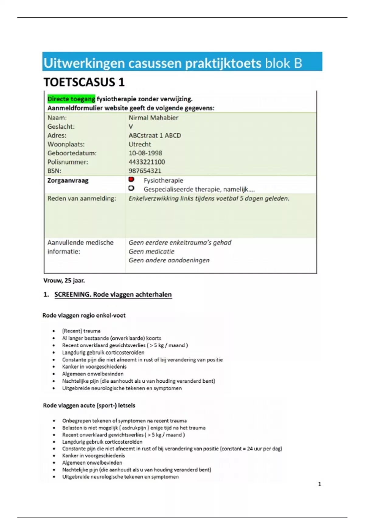Uitwerkingen van de casussen voor de praktijktoets blok B werk sport hobby fysiotherapie.